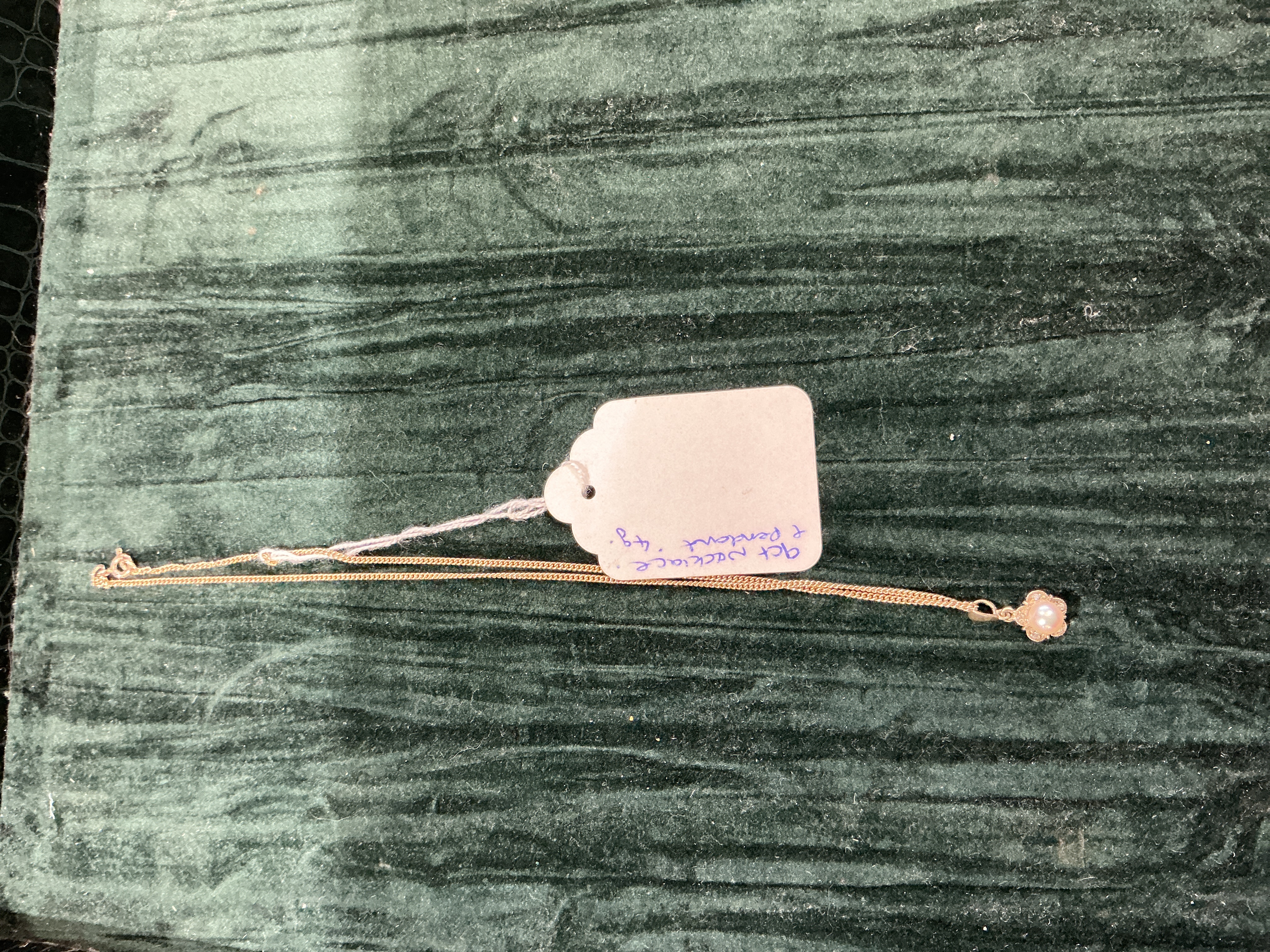 A 9 ct gold necklace and pearl pendant. The fine link chain supports a pendant designed with a floral motif, featuring a single round white cultured pearl at the centre. The surrounding petals are set with small, round colorless accent stones which appear to be diamonds. The jewellery is crafted in 9 ct yellow gold. No hallmarks or maker’s marks are visible in the provided image. Weight: 4g (as per accompanying handwritten tag). Chain length: approximately 40cm.