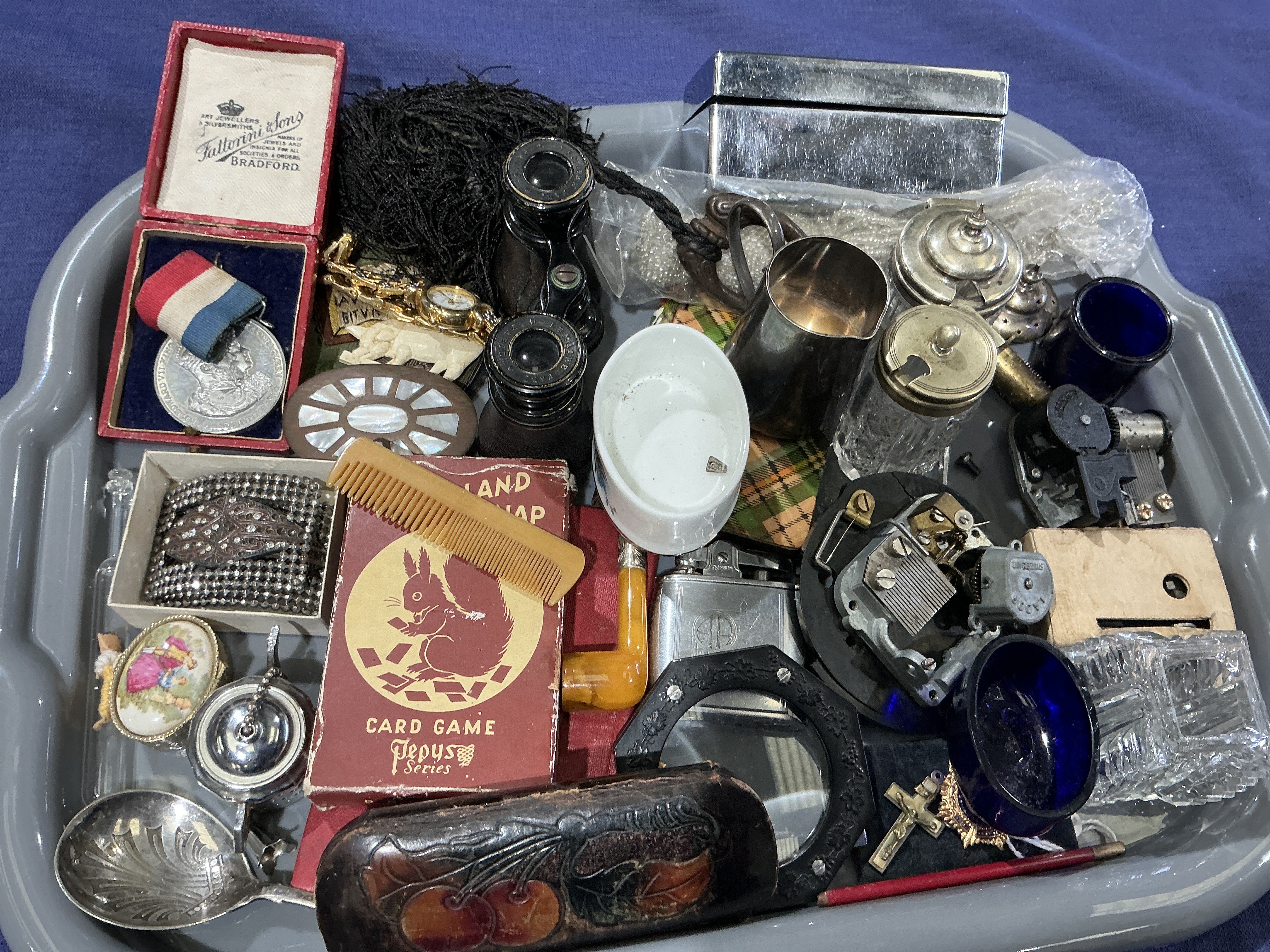 A diverse assortment of vintage jewellery and miscellaneous collectibles. The jewellery component includes a yellow-metal ladies’ watch mounted upon a foliate-style brooch, a wide silver-toned cuff bracelet pave-set with numerous round-cut colourless stones, and an oval porcelain pendant or brooch featuring a polychrome painted scene. Also present are strands of white beads, a small yellow-metal cross pendant, and a silver-toned commemorative medal with a tricolour ribbon, housed in its original red presentation box marked for Fattorini & Sons, Bradford. The lot is further comprised of various non-jewellery items including black opera glasses, mechanical music box movements, a yellow-stemmed pipe, decorative glass and silver-toned tableware, and a Pepys Series card game. The metals include a variety of yellow and silver tones; in the absence of visible hallmarks, these are treated as base metals or plated unless otherwise stated. The colourless stones in the cuff bracelet appear to be paste or crystal.
