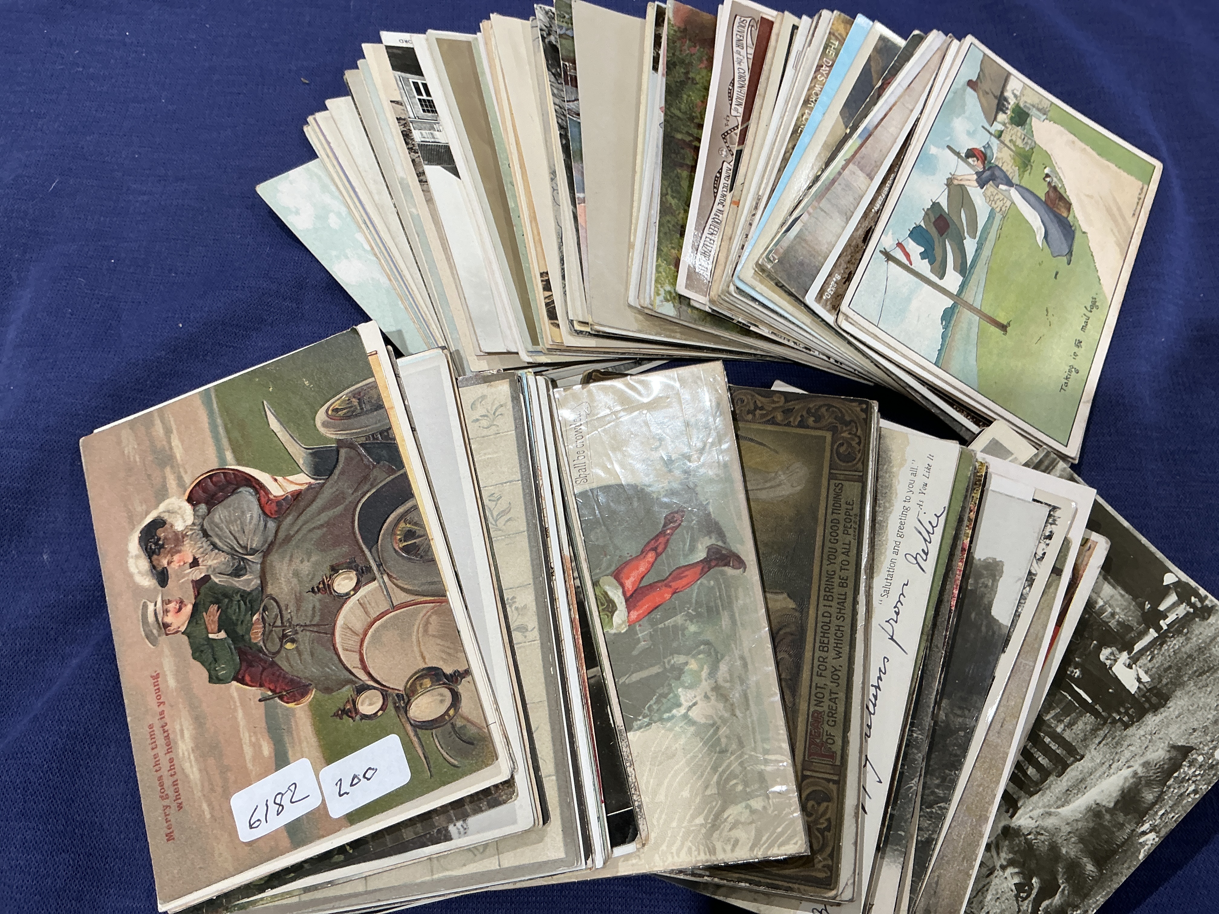 This extensive assortment comprises approximately 200 various age postcards and related ephemera, spanning the late 19th century through to the mid-20th century. The collection features a diverse range of subject matter, including Edwardian motoring scenes such as an early 20th-century card depicting a couple in a vintage open-top motor car captioned Merry goes the time when the heart is young. Humorous and novelty examples are present, including a comic illustration titled Taking in the mail bags and a theatrical card featuring red stockings. The lot contains a significant topographical section with landscapes, street scenes, and architectural views in various formats, including colour lithographs, sepia tones, and real photo postcards (RPPCs). Notable commemorative items include a 1953 souvenir card for the Coronation of H.M. Queen Elizabeth II. The collection also includes seasonal greetings and religious verses, many featuring contemporary handwritten messages and postal history. This lot offers a comprehensive overview of social history and the Golden Age of postcards, including potential early Gruss Aus examples and various commercial imprints from the United Kingdom and abroad. Dimensions: Approximately 140mm x 90mm.