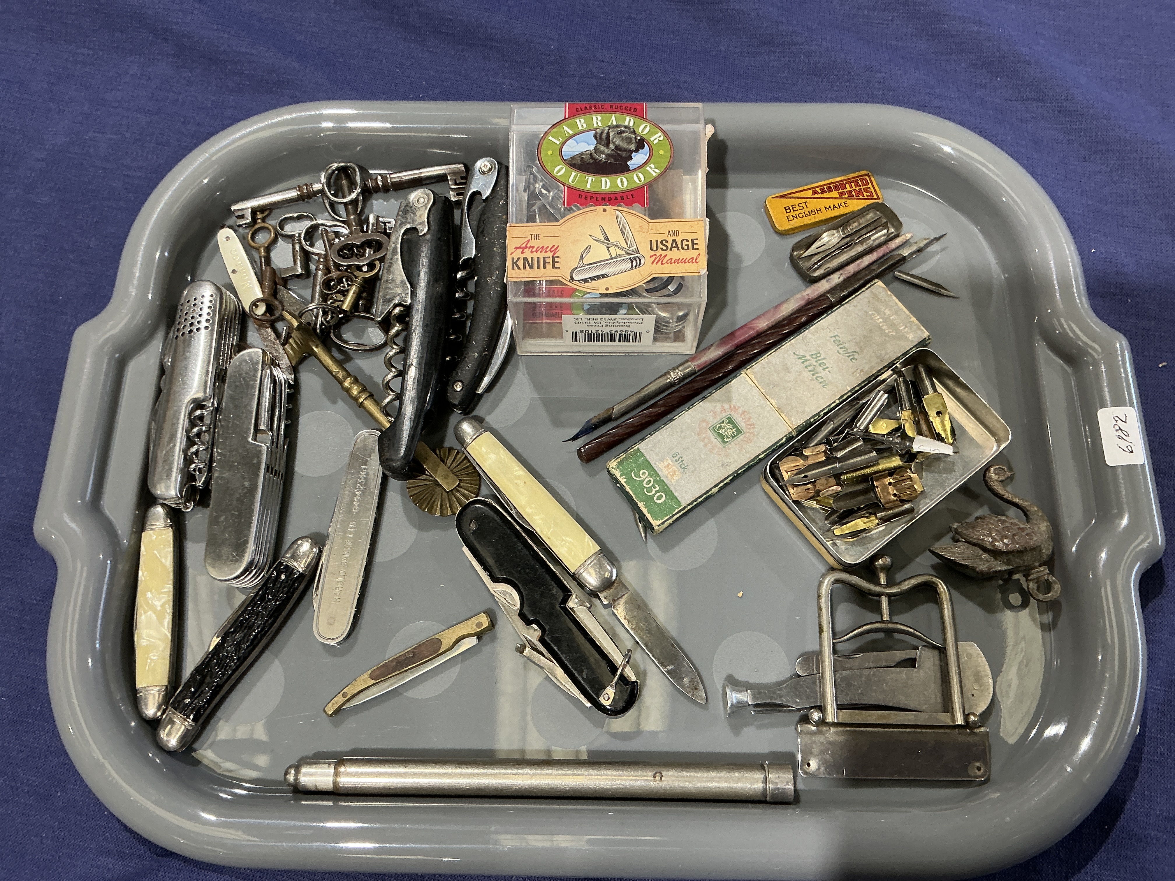 A diverse collection of 20th-century personal effects and stationery ephemera. The lot features a Labrador Outdoor The Army Knife retail package including the original illustrated usage manual published by Running Press, Philadelphia and London. Also included is a vintage A.W. Faber-Castell 9030 green and white cardboard sliding box for 2.0mm graphite leads, manufactured in Stein bei Nürnberg, Germany. Writing instruments comprise two wooden dip pen holders, one with a purple and black marbled finish, a large quantity of steel and brass-tone nibs by makers such as Gillott, and a nickel-plated cylindrical drafting tube. Metalware includes a lithographed yellow and black Assorted Pens – Best English Make tin, a group of approximately ten steel skeleton keys on a wire ring, a brass-handled pattern tracing wheel, and a heavy nickel-plated adjustable press mechanism. The collection is rounded out by approximately eight folding pocket knives of various designs, including multi-blade Swiss Army styles attributed to makers such as Richartz, a large black-scaled knife with corkscrew, a slim silver-tone model marked HAROLD BAKER LTD, and various examples with imitation pearl and synthetic scales. A small cast-metal waterfowl figure is also present. Drafting tube length approx. 170mm; Faber-Castell box approx. 100mm x 30mm.