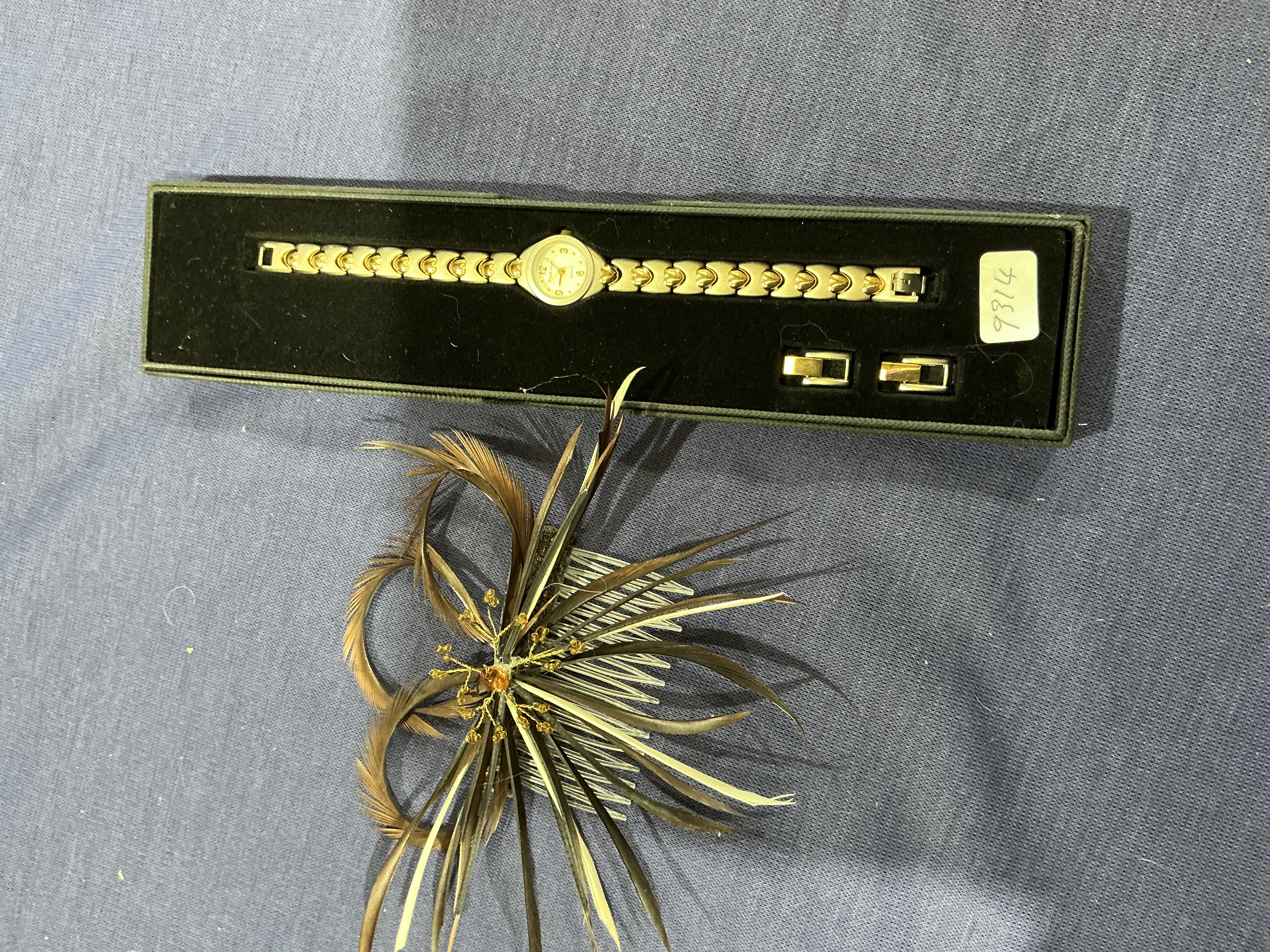Atelier Creation, ladies’ quartz wristwatch and feather hair ornament, gold-tone heart-link bracelet and variegated natural feathers, dial signed Atelier Creation. The watch features a cream dial with gold-tone hour markers and includes two additional links for bracelet adjustment. The hair fascinator is accented with amber-coloured beads on flexible wire stems and mounted to a clear plastic comb. Housed in a black velvet-lined presentation box.