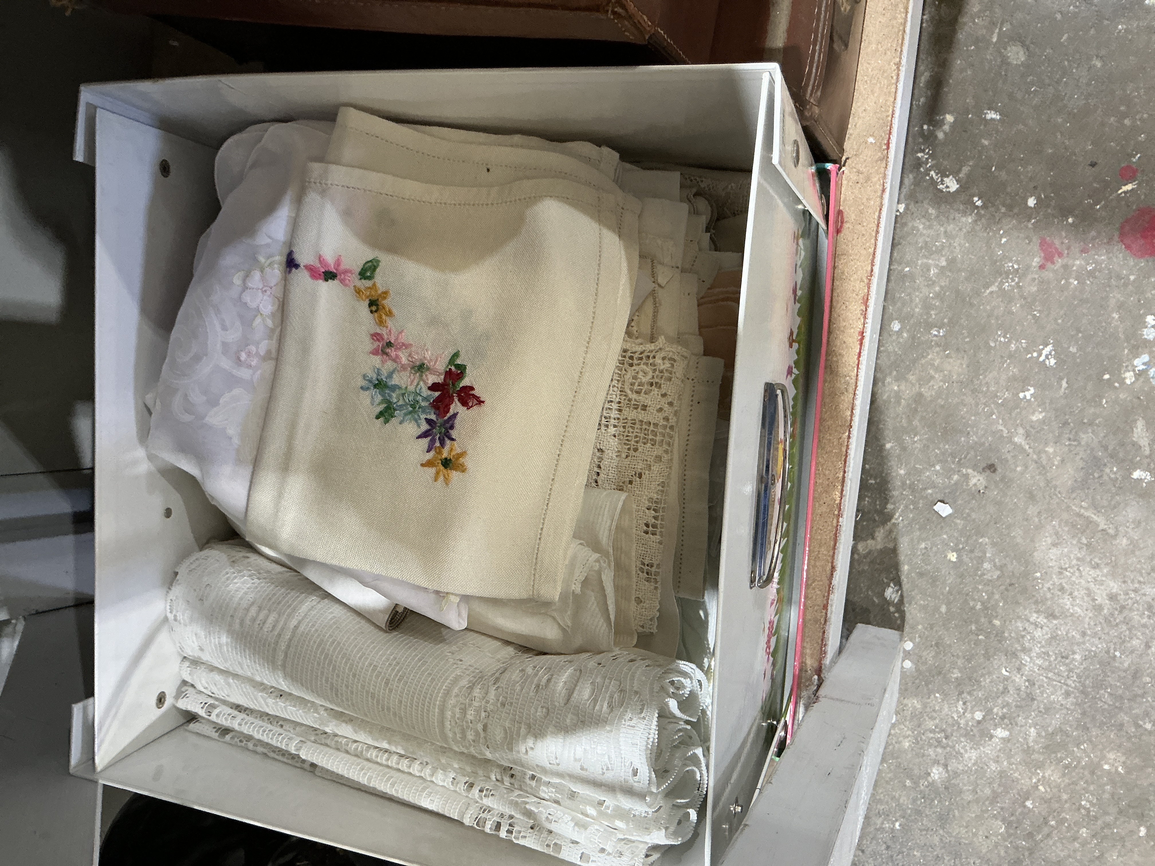 A varied assortment of vintage-style textiles and linens. The collection includes a cream-coloured cloth featuring multi-coloured floral embroidery, alongside several pieces of white lace-trimmed fabric and openwork linens. The items are constructed from natural fibres, appearing to be linen and cotton. No precious metals, gemstones, or jewellery components are present within this lot. The pieces exhibit traditional needlework techniques and decorative borders. No hallmarks or maker’s marks are visible.