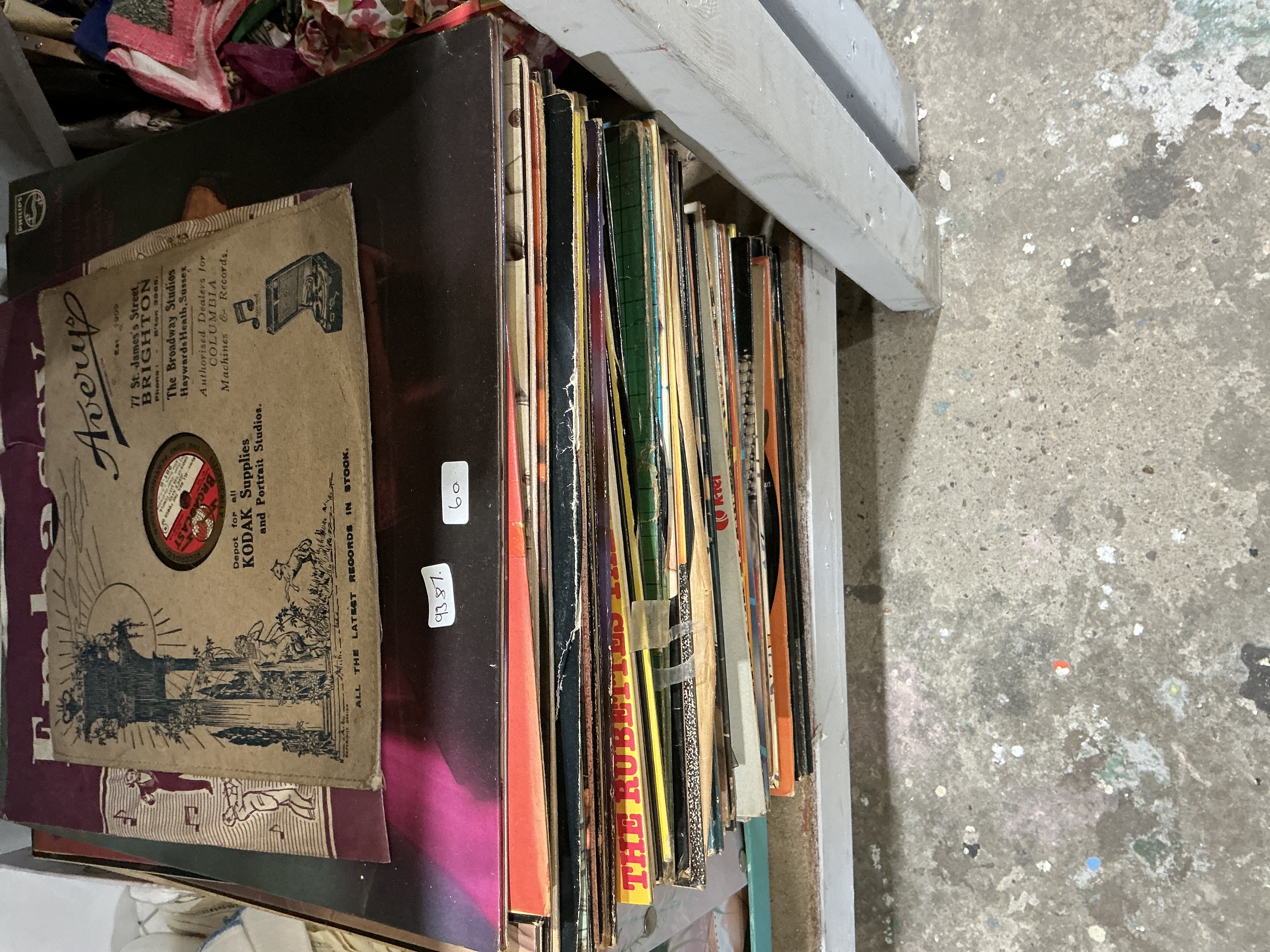 A varied collection of approximately thirty vintage records, featuring a combination of 12-inch vinyl long-playing albums and 10-inch 78 rpm shellac discs. The lot includes a notable Embassy brand shellac record within an original paper sleeve from Avery’s of Brighton, alongside releases from the Philips label. Pop and compilation titles are present, including The Rubettes and a K-tel release. The collection is housed in a variety of original period cardboard jackets and paper sleeves, providing a representative sample of mid-century musical media and graphic design. Dimensions: Approximately 31 cm x 31 cm (LPs) and 26 cm x 26 cm (78s).
