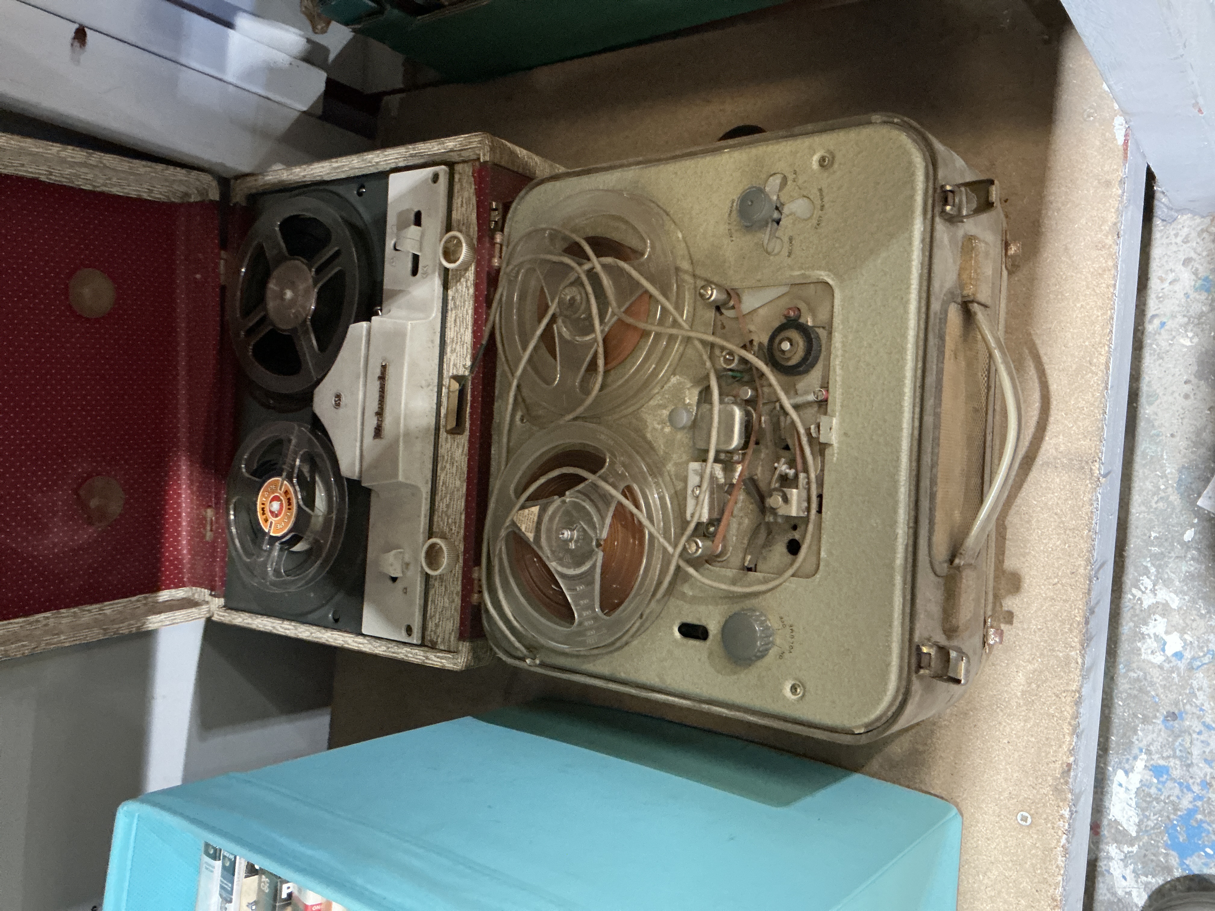 This catalogue entry describes three vintage items of audio-visual interest. The first is a Ferrograph Model 5 portable magnetic tape recorder, a staple of British recording history, featuring a beige textured carrying case and a three-knob control interface. The second is a Webcor portable reel-to-reel tape recorder, housed in a two-tone hard-shell case with a red and white patterned lining. The third component is a turquoise plastic bin containing a small library of assorted books and media cases, including one volume with distinct red and white spine lettering.