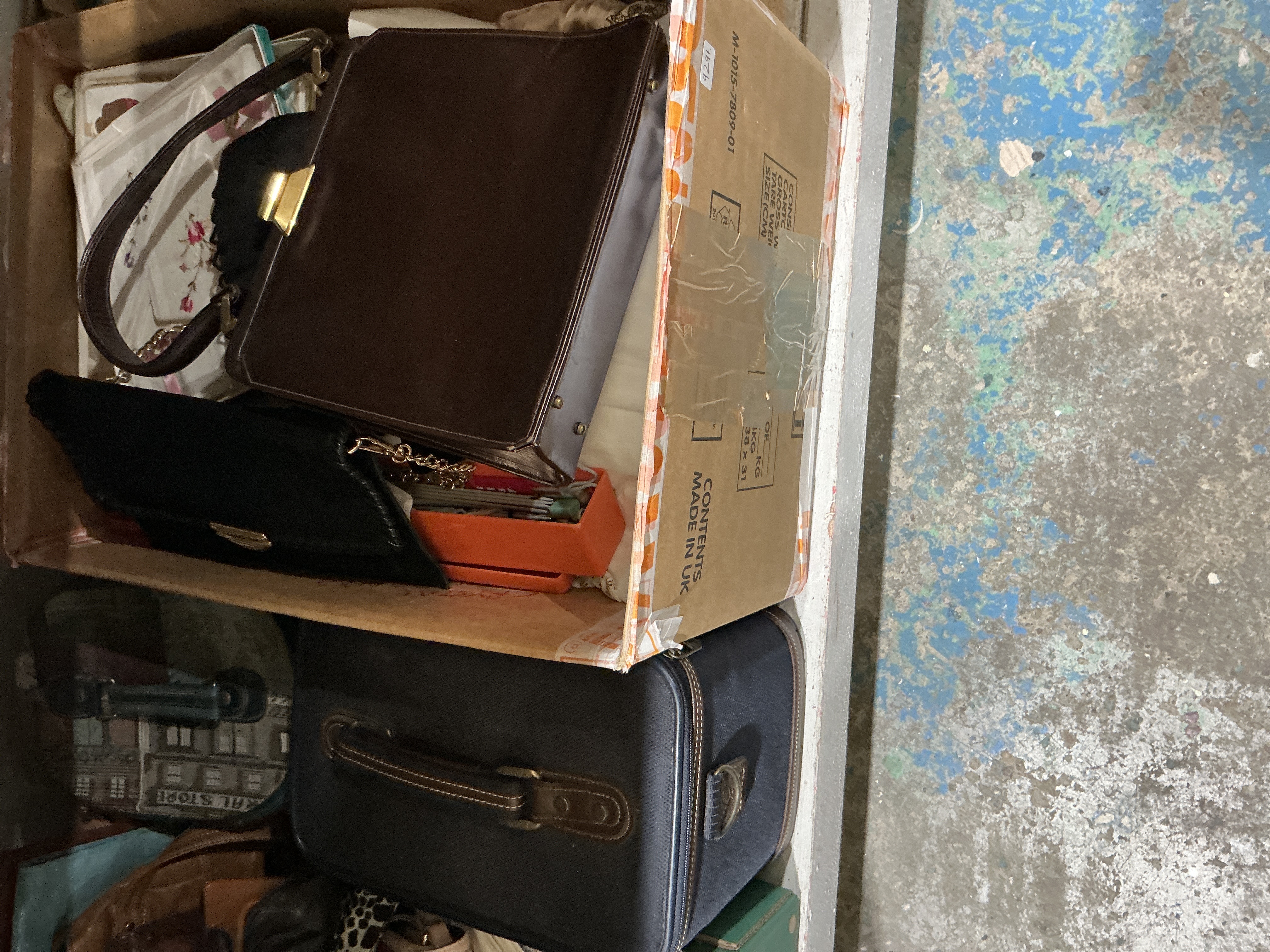 A collection of vintage accessories including an unbranded structured mid-century top-handle frame bag crafted from dark espresso brown leather with gold-tone metal flip clasp and protective feet; a rectangular navy blue vanity or train case featuring chocolate brown contrast trim and brass-tone hardware mounts; a black textured synthetic clutch or shoulder bag with a gold-tone chain strap; a novelty print bag featuring a General Store graphic; and a white bag with a pink and green floral motif. The lot is contained within a cardboard box marked Contents Made in UK. No designer branding, serial codes, or original packaging are present. Dimensions: Brown bag approx. 10in x 8in x 3in.