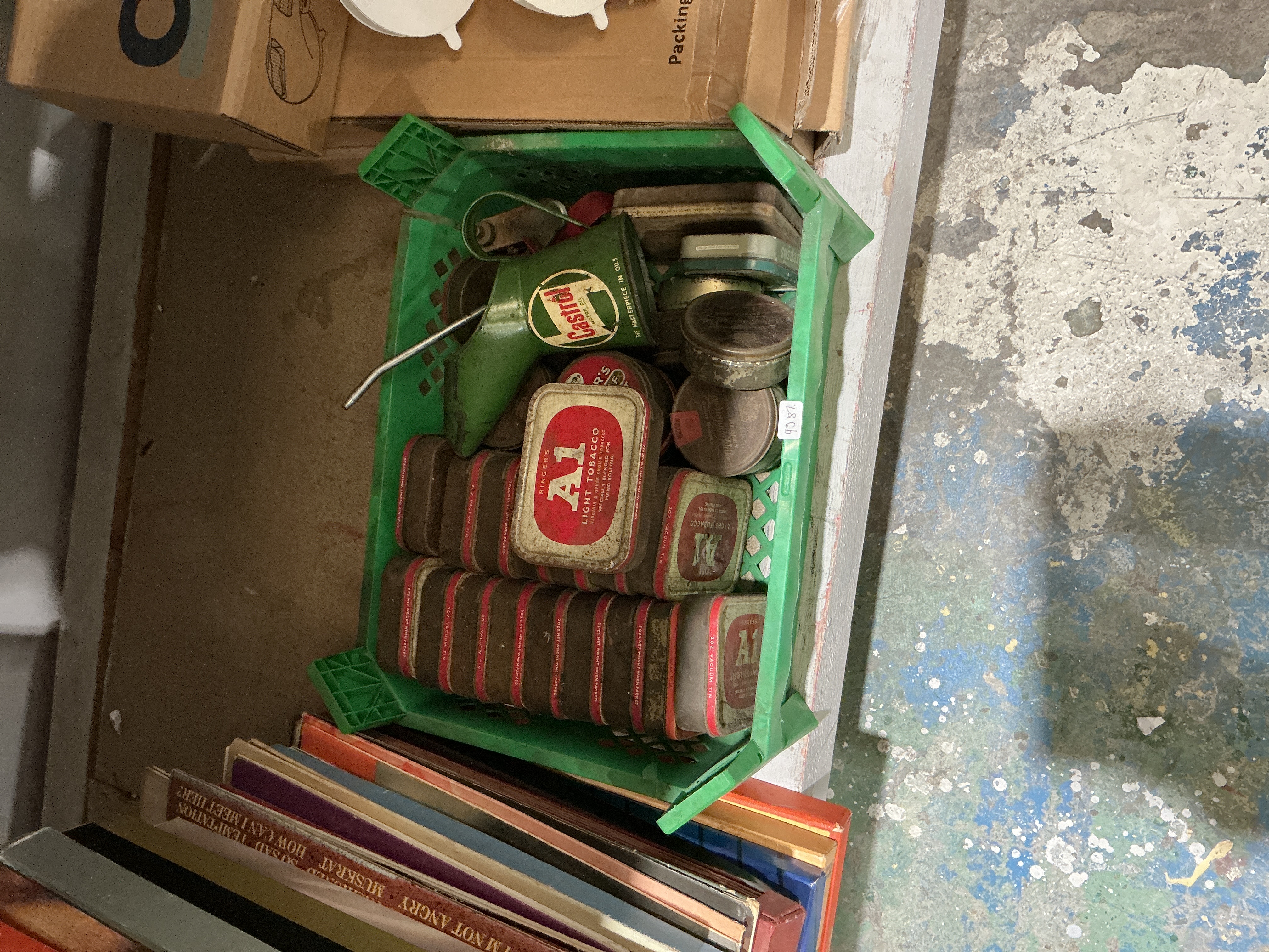 A varied collection of vintage advertising and automobilia items. The primary component consists of a group of Ringers A1 Light Tobacco tins, each a 2 oz vacuum-sealed container featuring distinctive red and gold lithographed graphics. Accompanying the tobacco tins is a vintage green Castrol motor oil pourer, complete with a fixed metal spout and the brand’s signature The Masterpiece in Oils slogan. The lot is further supplemented by several smaller, miscellaneous round metal tins of various designs. These items represent a cross-section of mid-century commercial packaging and workshop utility.