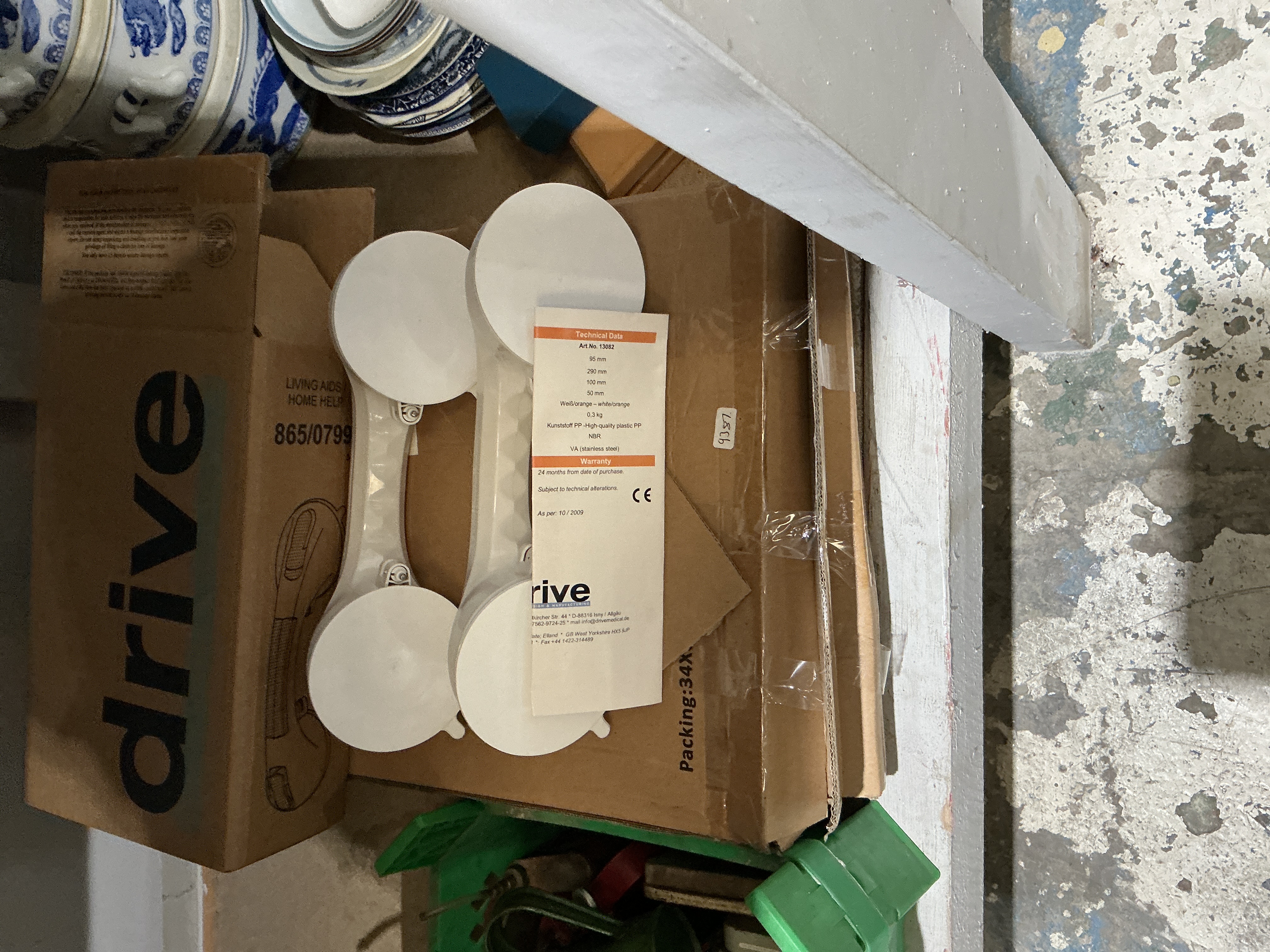 A pair of suction-cup grab bars manufactured by Drive Medical, identified as article number 13082. These safety aids are constructed from high-quality white and orange polypropylene plastic (Kunststoff PP) with NBR rubber suction pads and stainless steel (VA) internal components. Designed for the Living Aids Home Help range, these items were engineered for portable support in bathroom environments. The lot includes the original technical data sheet, which provides specifications in both German and English, and the original branded outer cardboard packaging bearing reference number 865/0799. The technical documentation is dated October 2009. Suction cup diameter 95 mm, total length 290 mm, height 100 mm, handle diameter 50 mm.
