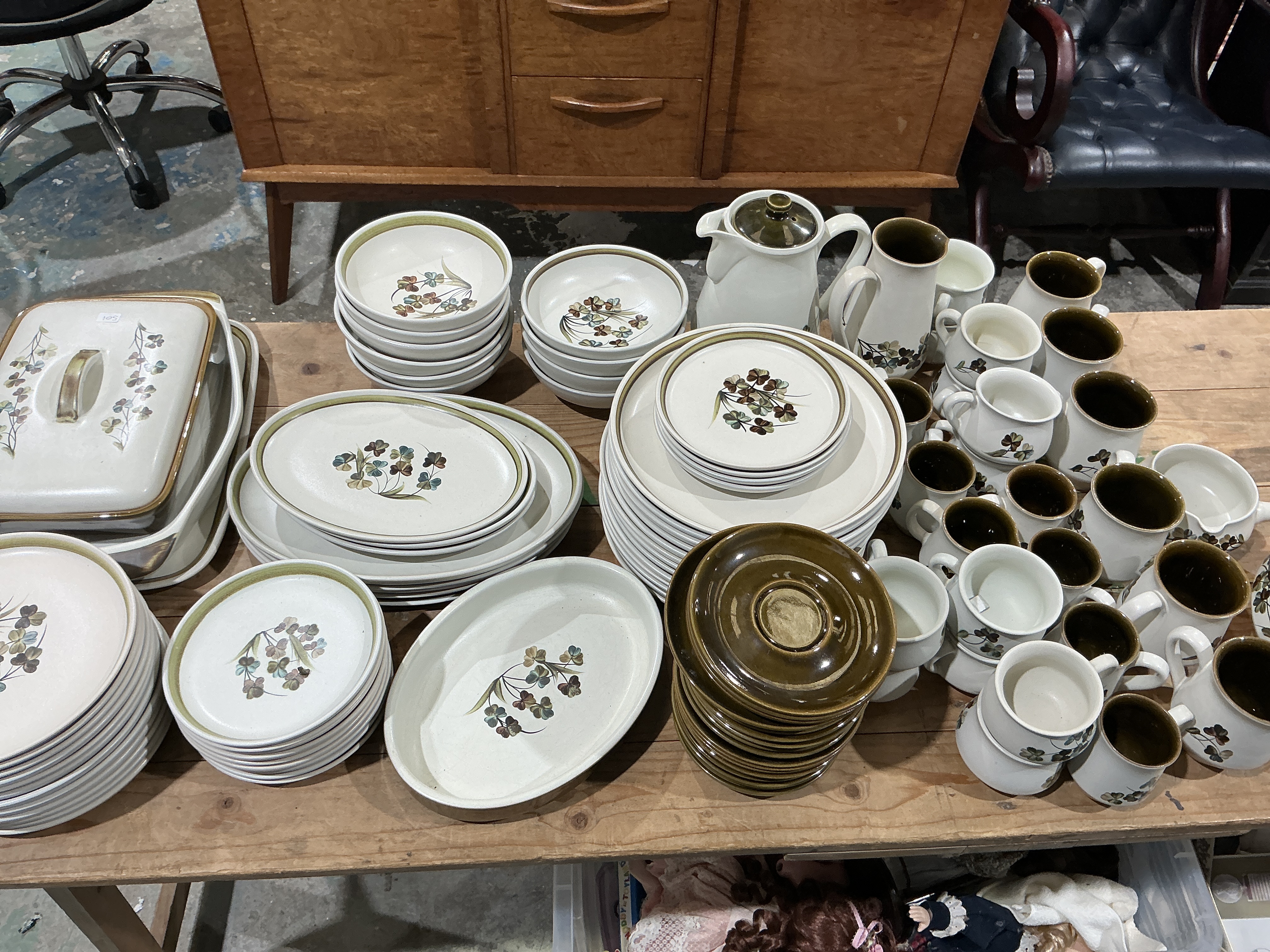 A comprehensive service of vintage stoneware manufactured by Denby Pottery, Derbyshire, England, in the popular Shamrock pattern. The collection features a characteristic cream-coloured speckled glaze decorated with hand-painted or lithographed stylised wildflower and clover motifs in a palette of olive green and earthy browns. The service comprises a wide variety of forms including multiple dinner plates, luncheon plates, side plates, soup or cereal bowls, two oval serving platters, and a large rectangular covered casserole dish. The tea and coffee service includes a teapot with lid, two graduated cream jugs, and a large quantity of mugs, some of which feature a contrasting solid dark brown interior glaze, accompanied by a stack of coordinating chocolate brown glazed saucers. Each piece reflects the robust, functional aesthetic of British Mid-Century Modern design. The undersides bear the blue printed factory mark reading DENBY / MADE IN ENGLAND along with various numerical production codes. Dinner plates approximately 25cm diameter; teapot approximately 18cm height.
