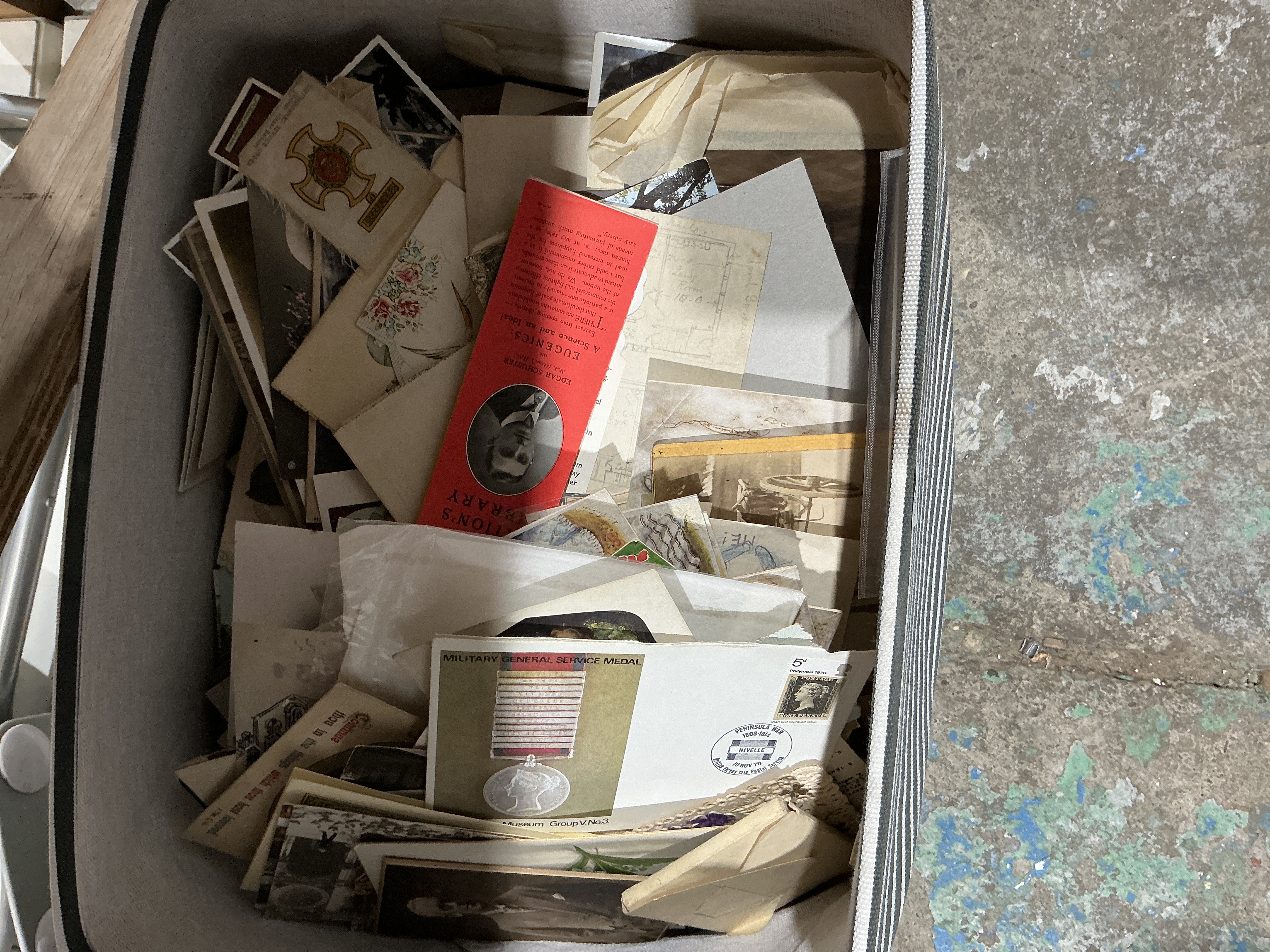 A diverse bulk lot of printed and handwritten ephemera comprising a wide range of social, scientific, and historical subjects. A notable inclusion is the pamphlet Eugenics: A Science and an Ideal by Edgar Schuster, published by William Collins Sons and Co. for The Nation’s Library series circa 1913, which features a monochrome portrait of the author and reflects early 20th-century scientific discourse. Philatelic items include a 1970 Philympia commemorative envelope depicting the Military General Service Medal (1793-1814) with a Peninsula War postmark dated 10 November 1970 and a 5p Queen Elizabeth II stamp. The lot contains various early to mid-20th-century postcards and greeting cards with floral motifs, topographical views, and gilt-embossed religious emblems. Photography includes several black-and-white portrait studies and candid interior scenes. Additional ephemera includes an architectural floor plan sketch, handwritten notes, and cards featuring Gothic-style script. Bin dimensions: 35cm x 30cm x 25cm.