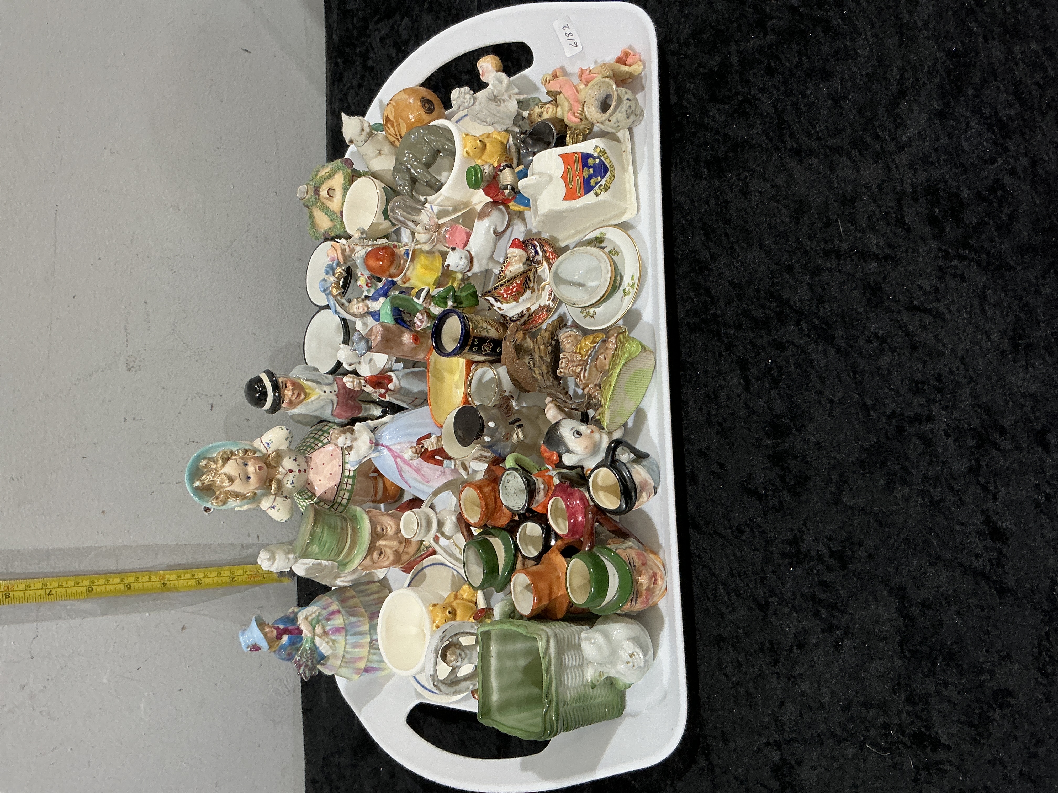 This varied collection comprises a large assortment of miniature ceramic and porcelain decorative pieces. The lot includes several Toby and character-style jugs of varying sizes, miniature teacups with saucers, and various human figures depicted in period costume. Animal subjects are well-represented, featuring a cat, an elephant, and a dog, alongside a green basket-weave planter with an integrated white animal figure. Also included is a miniature thatched cottage. The pieces are constructed from polychrome glazed earthenware and porcelain, typical of mid-to-late 20th-century souvenir and cabinet collectibles. An inventory label marked 6182 is present on the carrying tray. Tray measures approximately 50 cm in length; individual figurines range from approximately 2 cm to 10 cm in height.