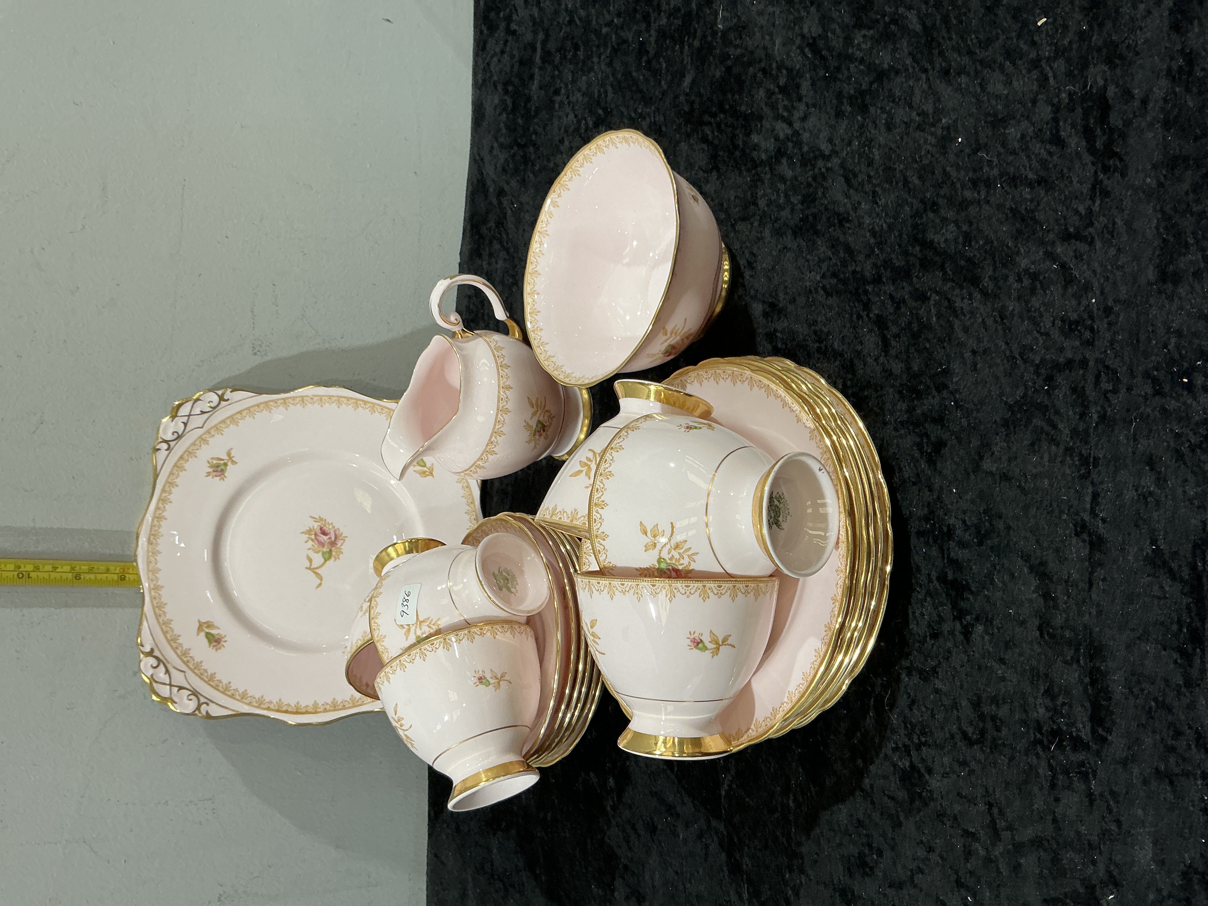 A partial tea service manufactured by Tuscan (R. H. & S. L. Plant Ltd) of Longton, Staffordshire, dating to the mid-20th century. The set is crafted from fine English bone china and features a delicate pale pink ground. Each piece is decorated with central and peripheral floral rose sprays, framed by intricate gilded filigree borders and finished with gold-trimmed scalloped rims. The service comprises four teacups with gilded handles and foot rings, four saucers, four side plates, a cream jug, an open sugar bowl, and a square cake plate with integral handles. The underside of the pieces bears the green printed maker’s mark: TUSCAN FINE ENGLISH BONE CHINA MADE IN ENGLAND, beneath a winged crown insignia. This pattern reflects the elegant traditional aesthetic popular in England during the post-war period. Square cake plate measures approximately 23cm across.