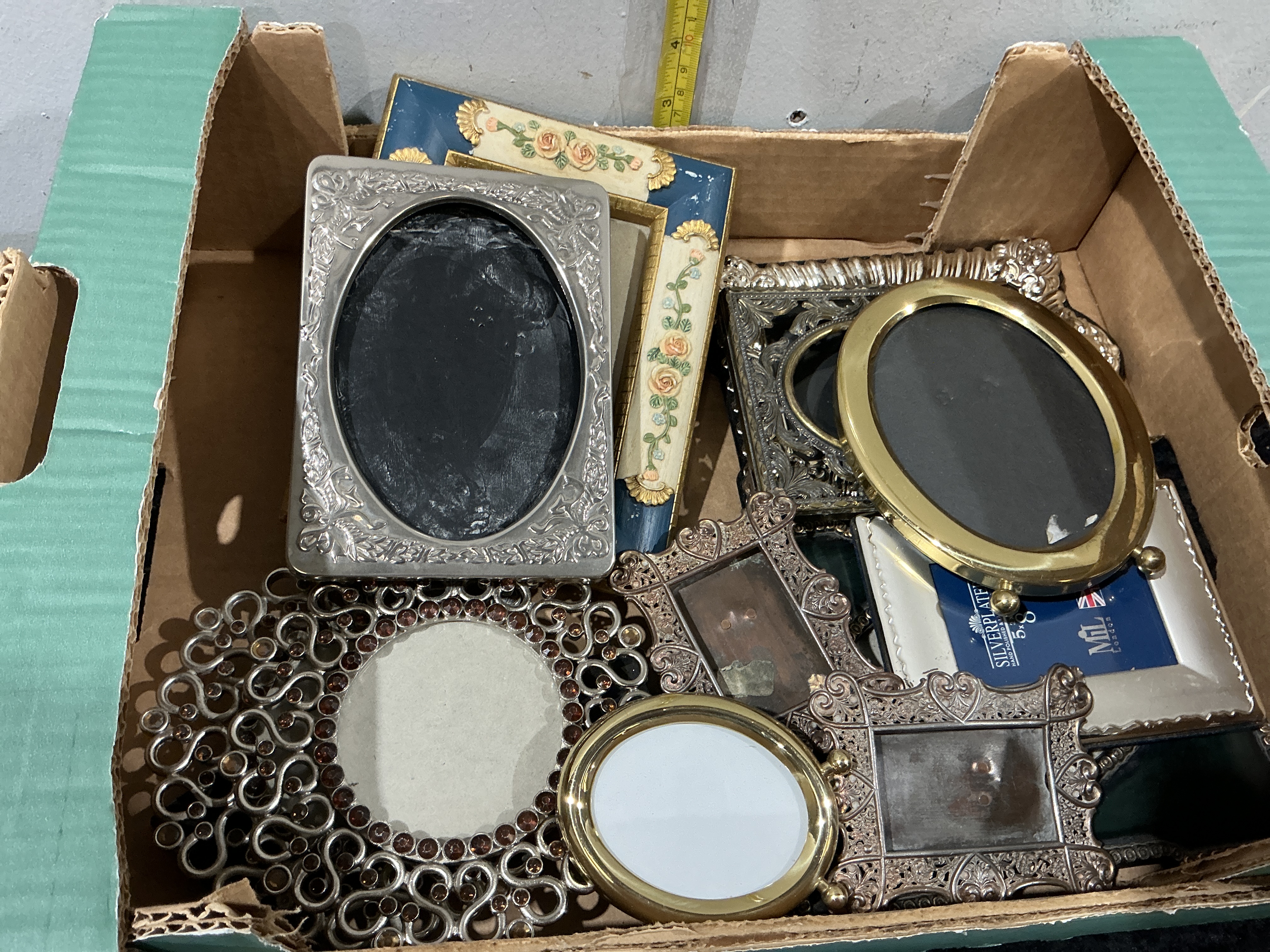 A varied collection of decorative picture frames in various sizes and formats, including rectangular, oval, and circular examples. The group comprises pieces constructed from silver-plated metal, brass, and gilded alloys. Notable items include a contemporary silver-plated rectangular frame by MiL London, featuring a hand-polished and lacquered finish; a circular frame with an intricate openwork filigree border set with faceted amber-coloured stones; and a rectangular frame finished in blue enamel with raised polychrome floral decoration. The collection displays various manufacturing techniques such as casting, stamping, and filigree work, with decorative motifs ranging from scrolling foliage to Victorian-style floral sprays. The lot includes pieces of both vintage and contemporary manufacture, reflecting Victorian and Edwardian revival aesthetics. Largest frame measures approximately 25 cm x 18 cm.