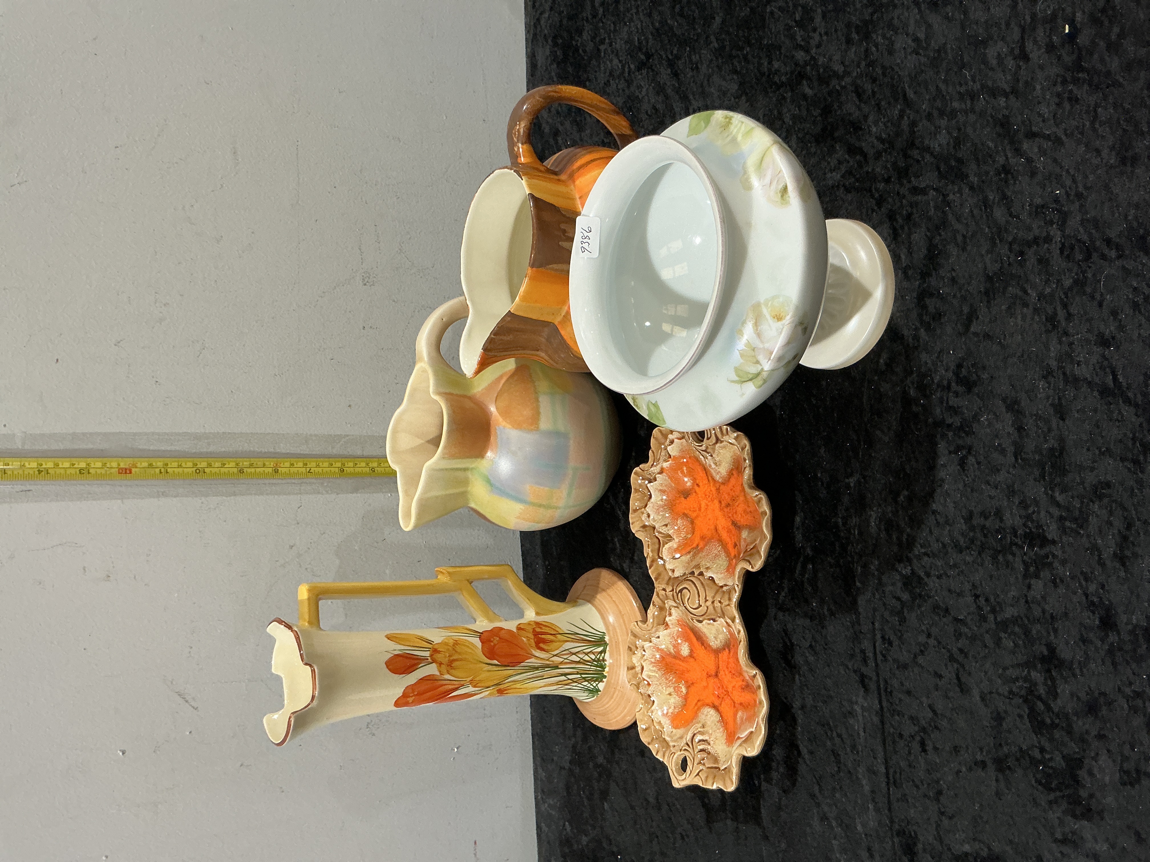 A varied collection of vintage decorative ceramic and porcelain wares comprising six pieces. The group includes a tall, slender earthenware vase of Art Deco influence, featuring a distinctive angular handle, scalloped rim, and hand-painted orange and yellow floral motifs against a cream ground. Also present are two pitchers: one decorated with a pastel geometric pattern and another featuring bold, earthy-toned horizontal bands in shades of brown and orange. The collection further includes a porcelain pedestal bowl with a pale green ground and hand-painted rose decoration, and two small, irregularly shaped dishes with a vibrant, textured orange glaze and moulded foliate details. These items demonstrate a range of twentieth-century decorative techniques including hand-painting and relief moulding. No maker’s marks are visible; the pedestal bowl bears a small white inventory sticker numbered 9386. Tallest vase measures approximately 28 cm in height.