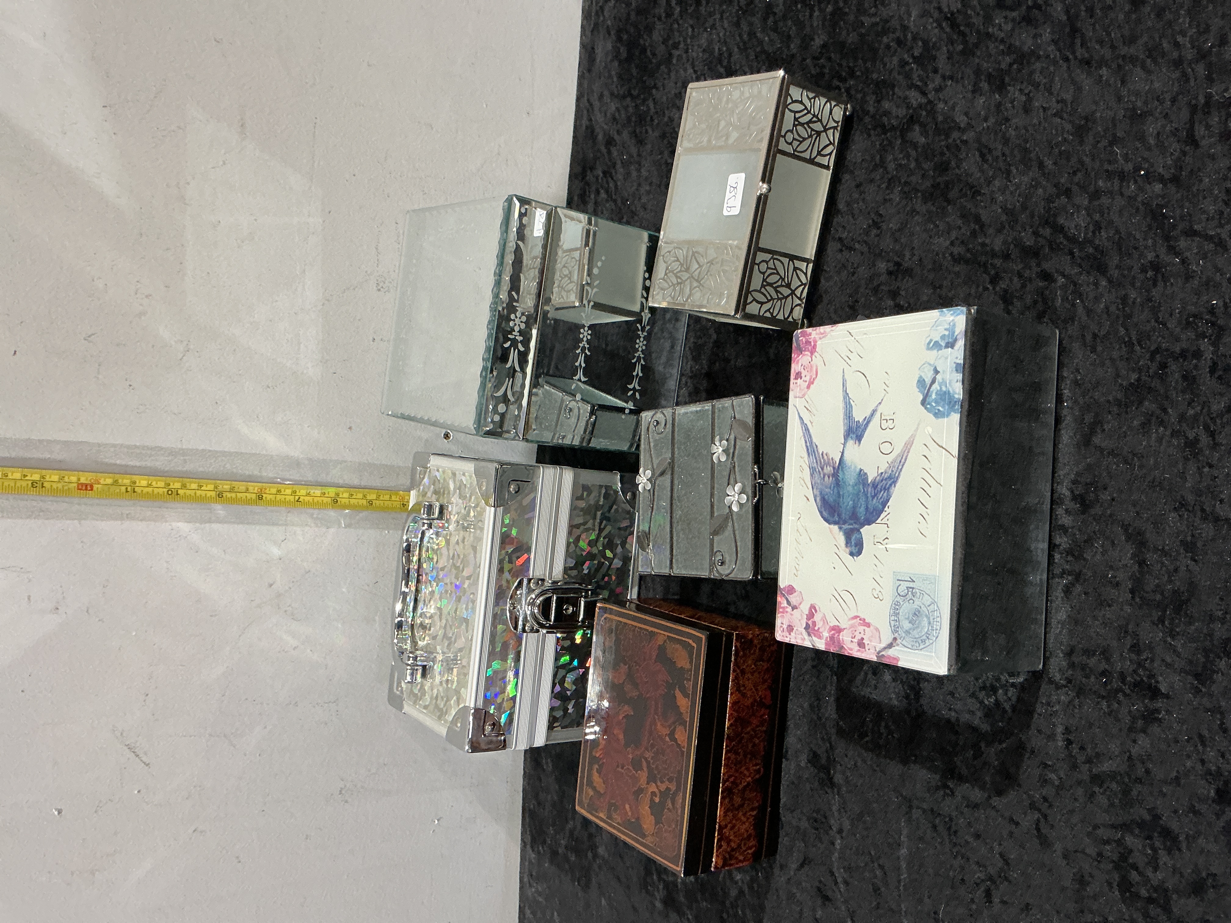 A collection of six decorative jewellery and trinket boxes including mirrored glass and mixed media examples