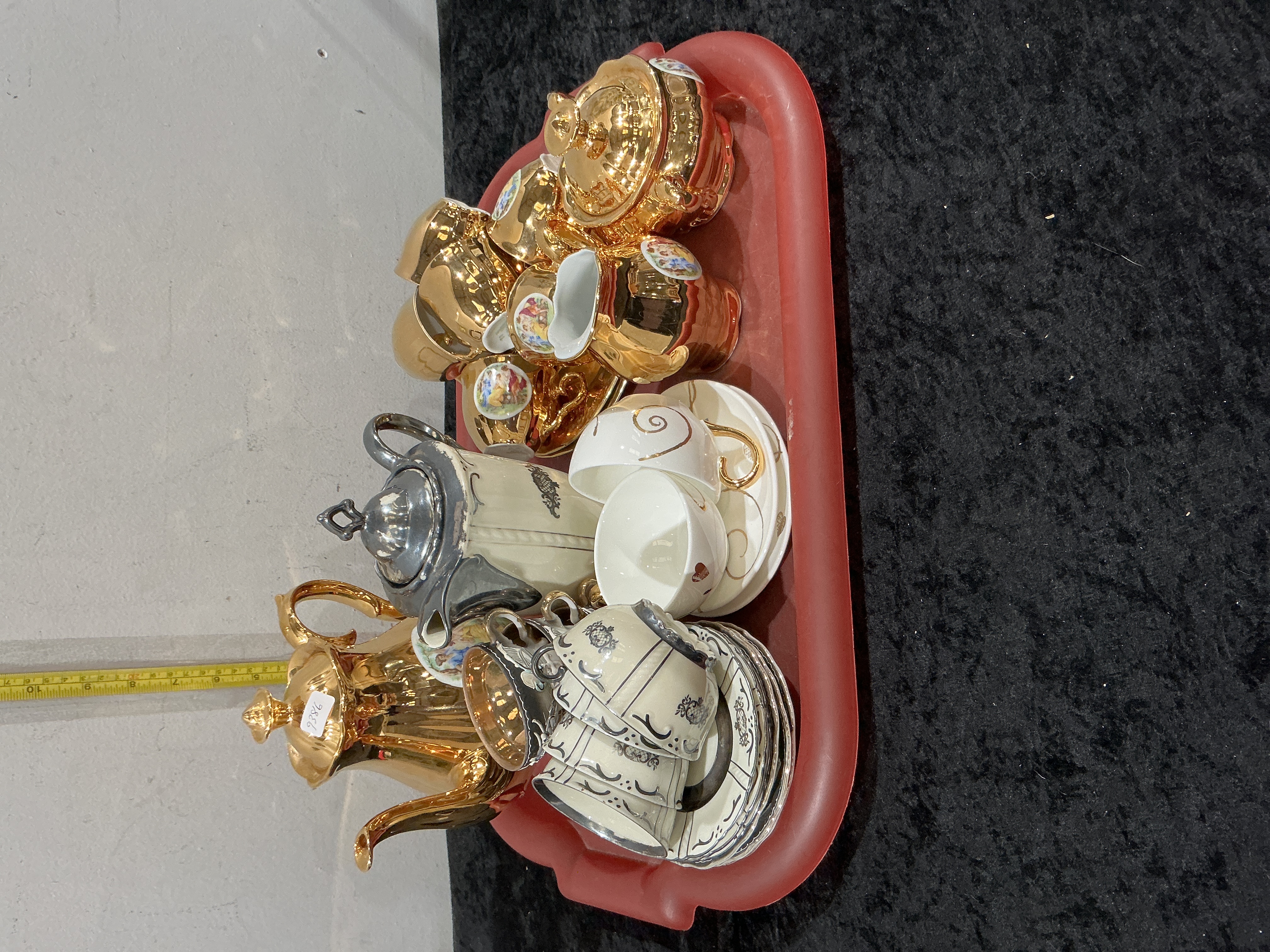 A varied collection of porcelain tea and coffee service items, primarily in the Turkish demitasse style. The group features a prominent set finished in a bright gold lustre glaze, comprising a tall coffee pot with a domed lid, a lidded sugar bowl, a creamer, and several demitasse cups and saucers, some of which are embellished with small polychrome floral medallions. Also included is a coffee pot featuring silver-toned lustre accents and cream-coloured panels decorated with black transfer-printed neoclassical designs, alongside multiple cream-bodied cups and saucers with coordinating black patterns. The lot is completed by two white porcelain cups with gilt-accented handles. These pieces are characteristic of mid-to-late 20th-century European decorative lustreware, often produced in Italy or Germany for the international market. Coffee pot height approximately 22 cm.