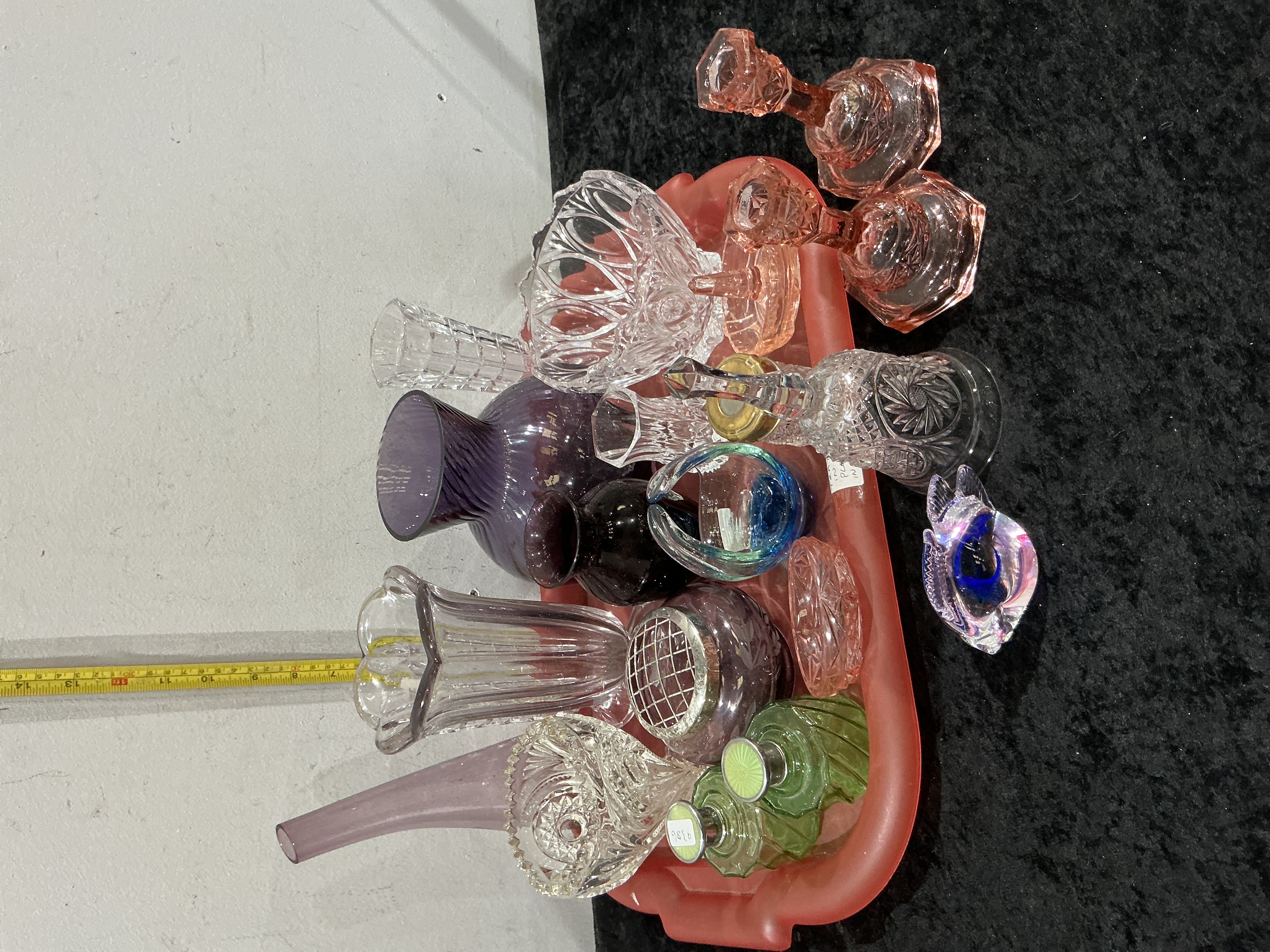 A diverse collection of decorative glass and crystal objects featuring various manufacturing techniques and styles. The lot includes a pair of rose pink pressed glass candlesticks of octagonal form, a purple glass rose bowl fitted with a circular metal lattice flower frog lid, and a large bulbous amethyst glass vase. The collection further comprises several pieces of wheel-cut crystal, including bowls and vases decorated with traditional starburst and diamond patterns, with some pieces attributed to Tyrone Crystal. Notable art glass pieces include a multicoloured fish figurine in the Murano style and an emerald green glass vessel. The colour palette is broad, encompassing clear, rose pink, deep amethyst, cobalt blue, and emerald green. The items represent various 20th-century styles from Depression-era pressed glass to Mid-Century Modern art glass. Largest items approximately 20 cm to 25 cm in height; tray width approximately 35 cm.