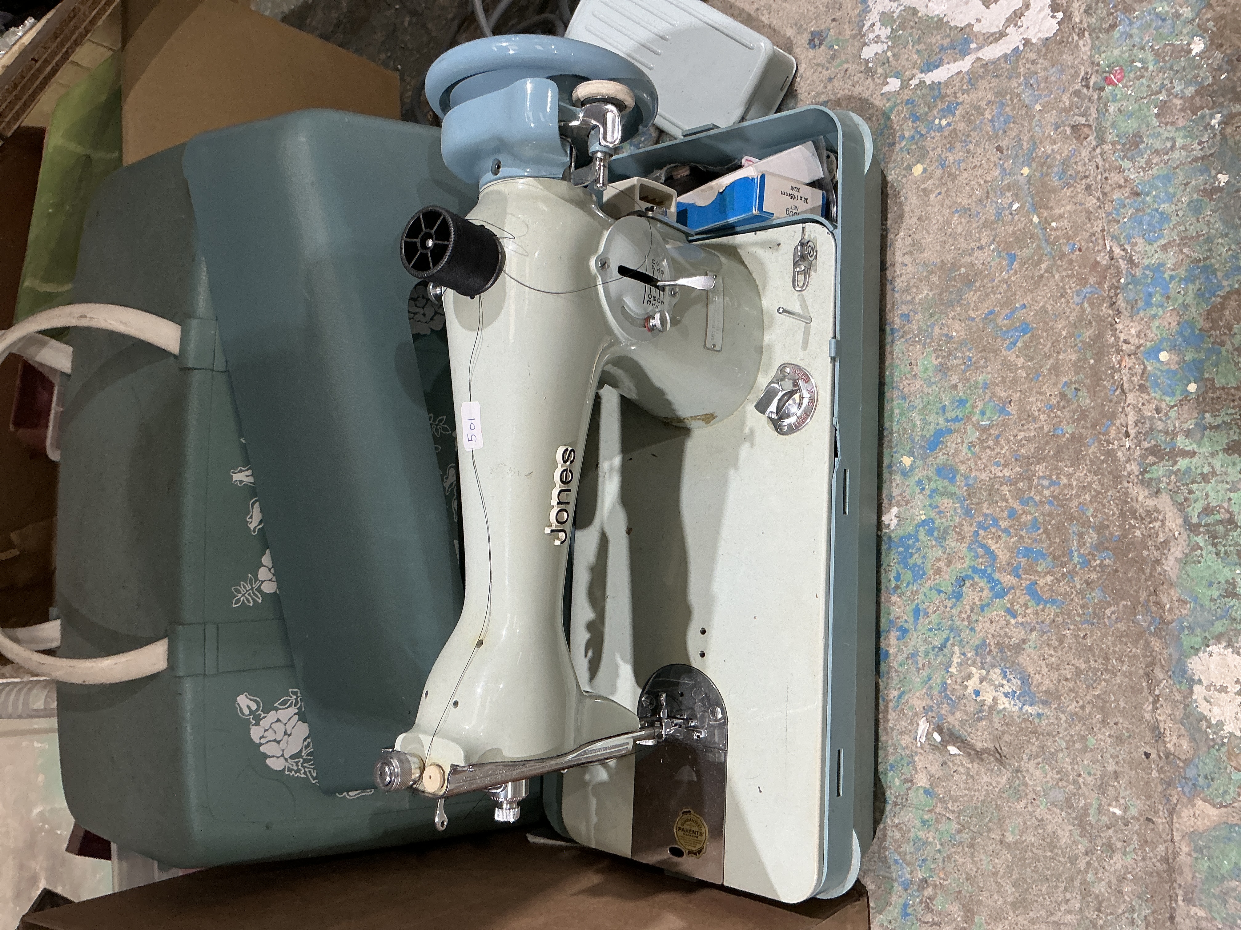 A mid-century portable electric sewing machine manufactured by Jones. The machine features a robust metal body finished in a period-correct pale green and blue colour palette. The arm is adorned with stylised silver Jones branding and a small adhesive inventory label numbered 501. Functional elements include a blue plastic handwheel, chrome-finished adjustment levers, and a stitch selection dial with settings for Normal, Silk, and Finish. A circular gold-toned emblem is situated near the needle plate. The unit is housed within its original teal-coloured hard plastic base and is accompanied by a separate foot pedal and a small box of needles. Jones was a significant British manufacturer, and this model exemplifies the transition to streamlined, portable domestic appliances during the post-war era.