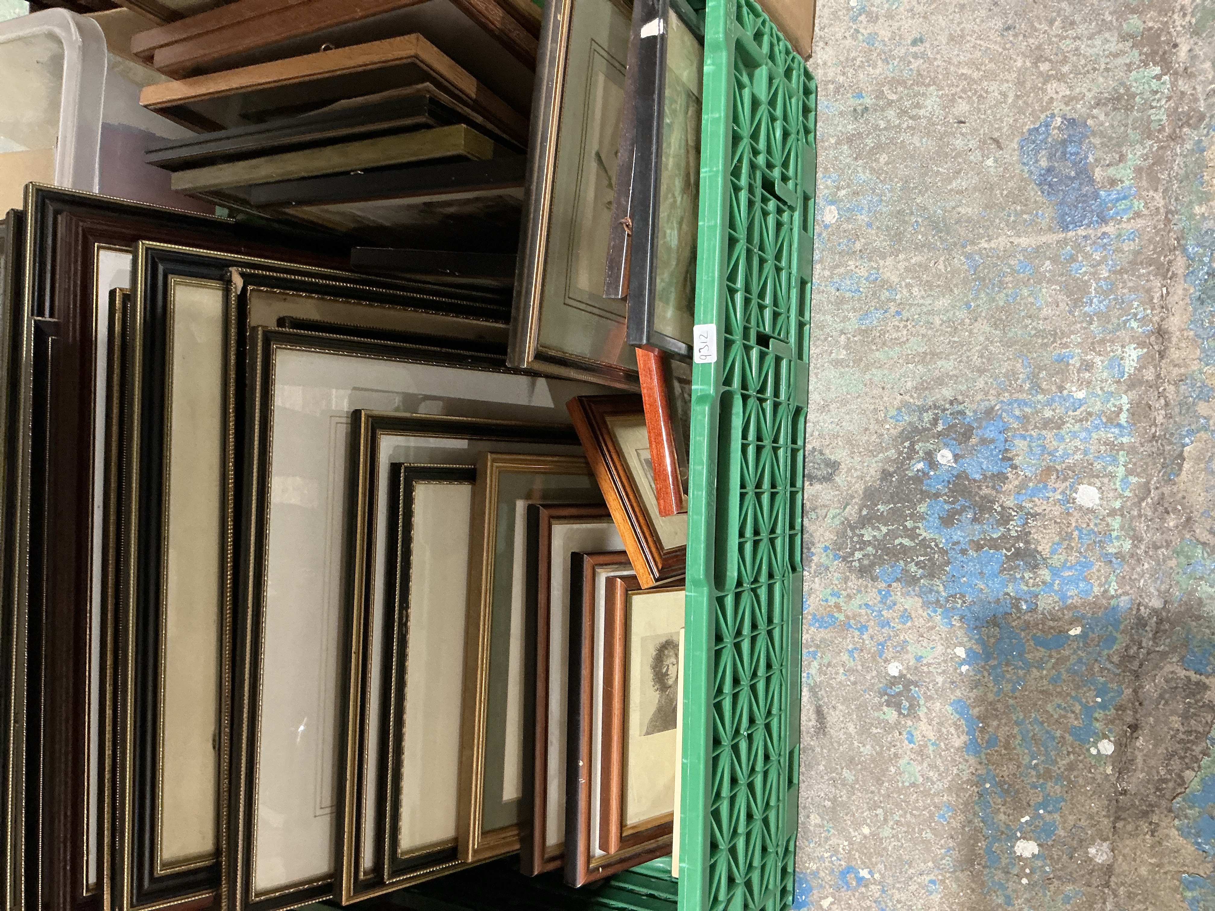 A diverse assortment of framed wall art and decorative prints presented within a green storage crate. The collection features a variety of framing styles, predominantly constructed from wood with finishes including mahogany-stained, natural timber, ebonised black, and gilt-detailed mouldings. The contents include a portrait of a female subject, various drawings, and photographic prints, the majority of which are protected by glazing. The frames exhibit traditional construction techniques with mitred corners, some featuring ornate beading reminiscent of the Stratford Collection by Imperial Frames and custom work by Studio de Chene. One frame is marked with a handwritten inventory sticker numbered 9312. This lot offers a broad range of decorative subjects suitable for interior styling or gallery use. Dimensions vary by piece, ranging from approximately 15cm x 20cm to 40cm x 50cm.