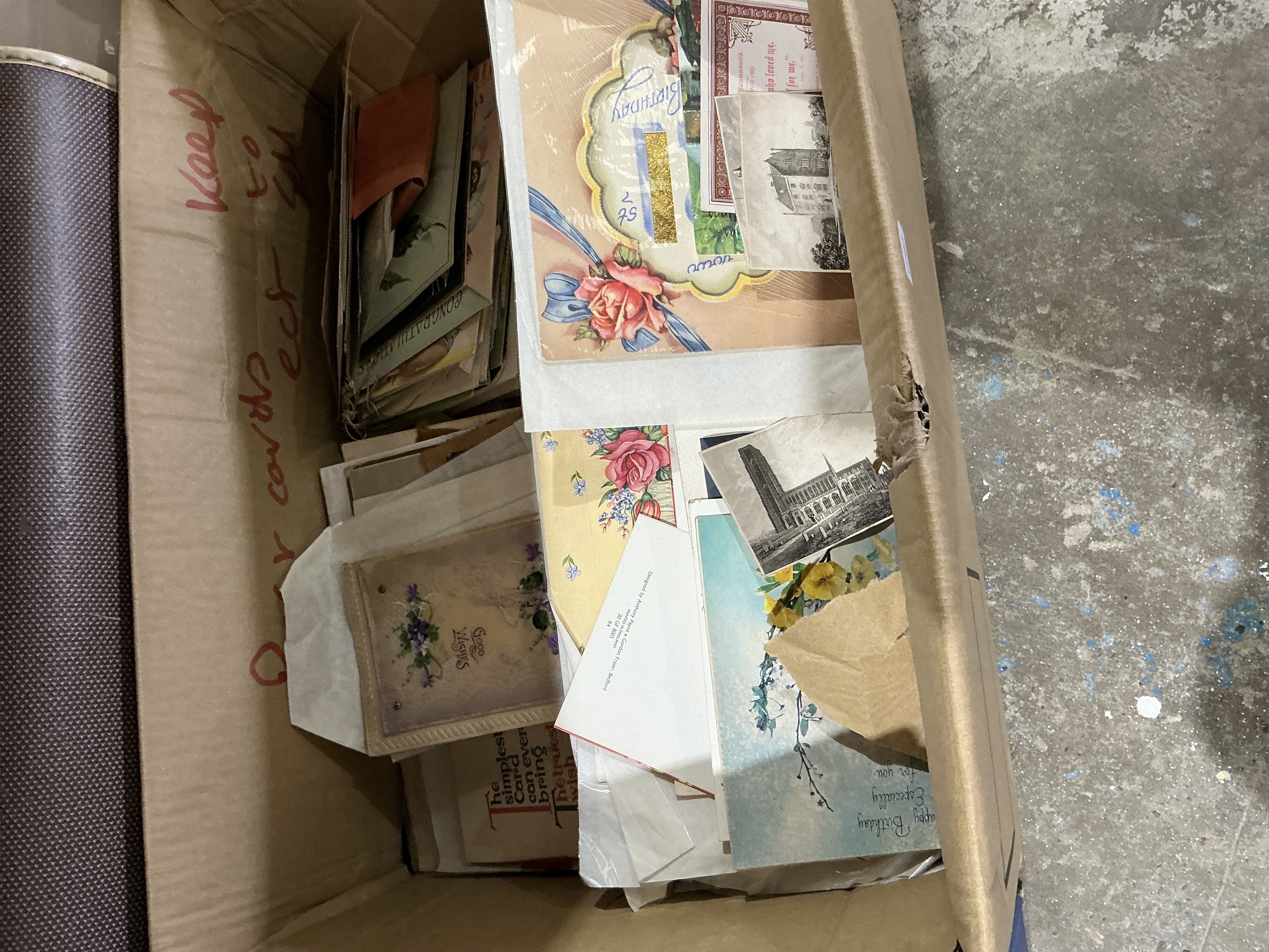 A substantial collection of paper ephemera, primarily comprising mid-20th century and later greeting cards and postcards, presented within a distressed cardboard storage box. The assortment includes a variety of printed designs featuring floral motifs, scenic architectural views, and occasion-specific sentiments such as Happy Birthday and Good Wishes. Production techniques include offset lithography, with several examples exhibiting decorative embossing and metallic foil detailing. Notable designers and publishers represented include Anthony Payne and Gordon Fraser of Bedford, among others. The lot contains a mixture of loose items and pieces protected within clear plastic sleeves. The collection offers an insight into mid-century graphic design and personal correspondence. Dimensions of box: approximately 40cm x 30cm x 25cm.