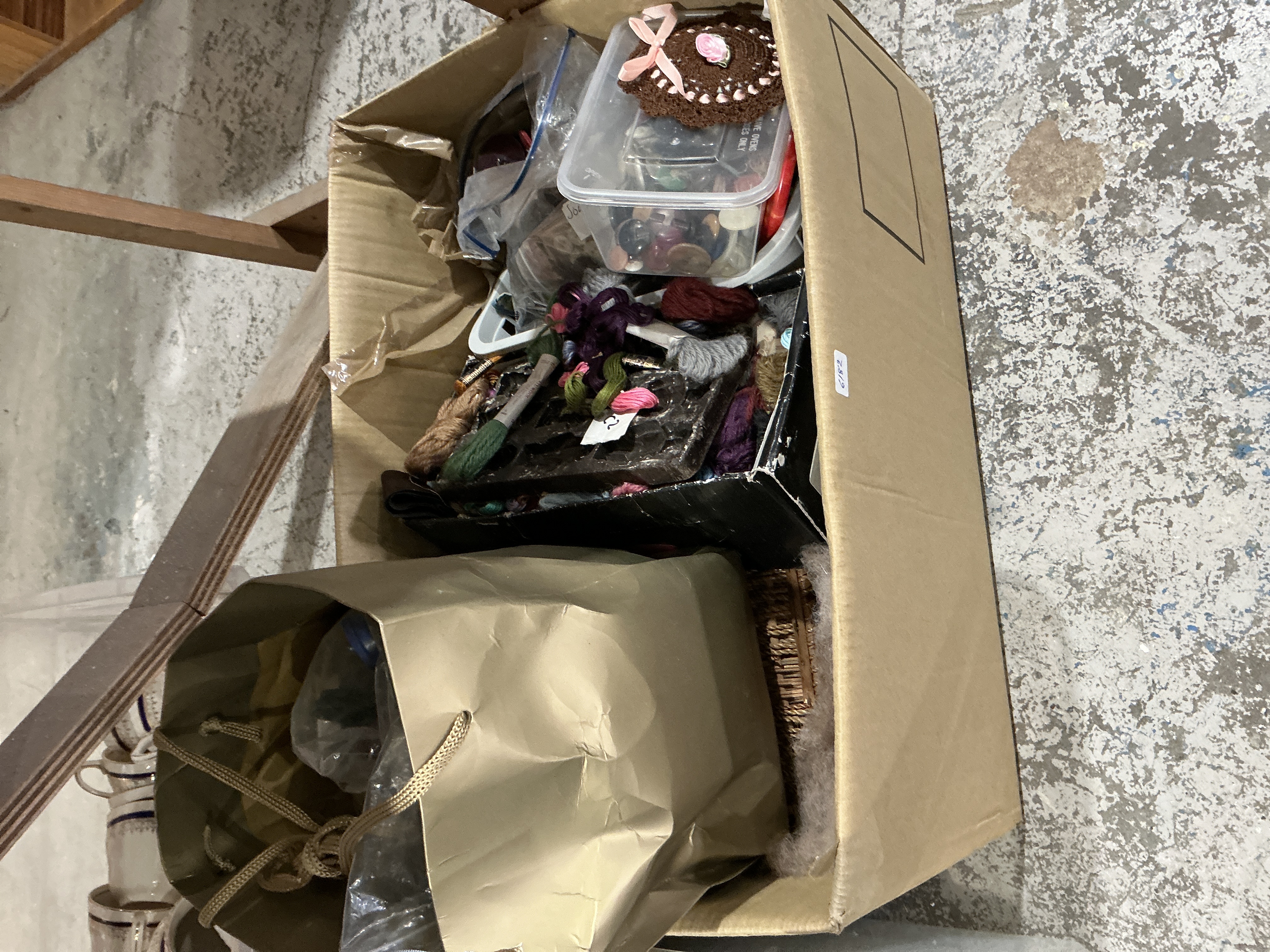 This lot features a comprehensive assortment of vintage and contemporary sewing and craft materials housed in a large cardboard shipping container. The collection includes a clear plastic storage tub containing a vast array of multi-colored buttons in various sizes and materials. Also included is a black cardboard box containing numerous hanks of colorful embroidery floss and yarn, some with handwritten identification tags. A large gold-toned paper gift bag contains additional unidentified craft components. Notable items include a small, hand-crocheted decorative piece in brown with pink ribbon accents and a rose motif, as well as loose batting or wool fibers suitable for stuffing or felting. Several items are organized within clear plastic zip-lock bags. The lot represents a diverse accumulation of notions and textile materials ideal for hobbyists or restorers. Measurements: Box approximately 24 x 18 x 16 inches.