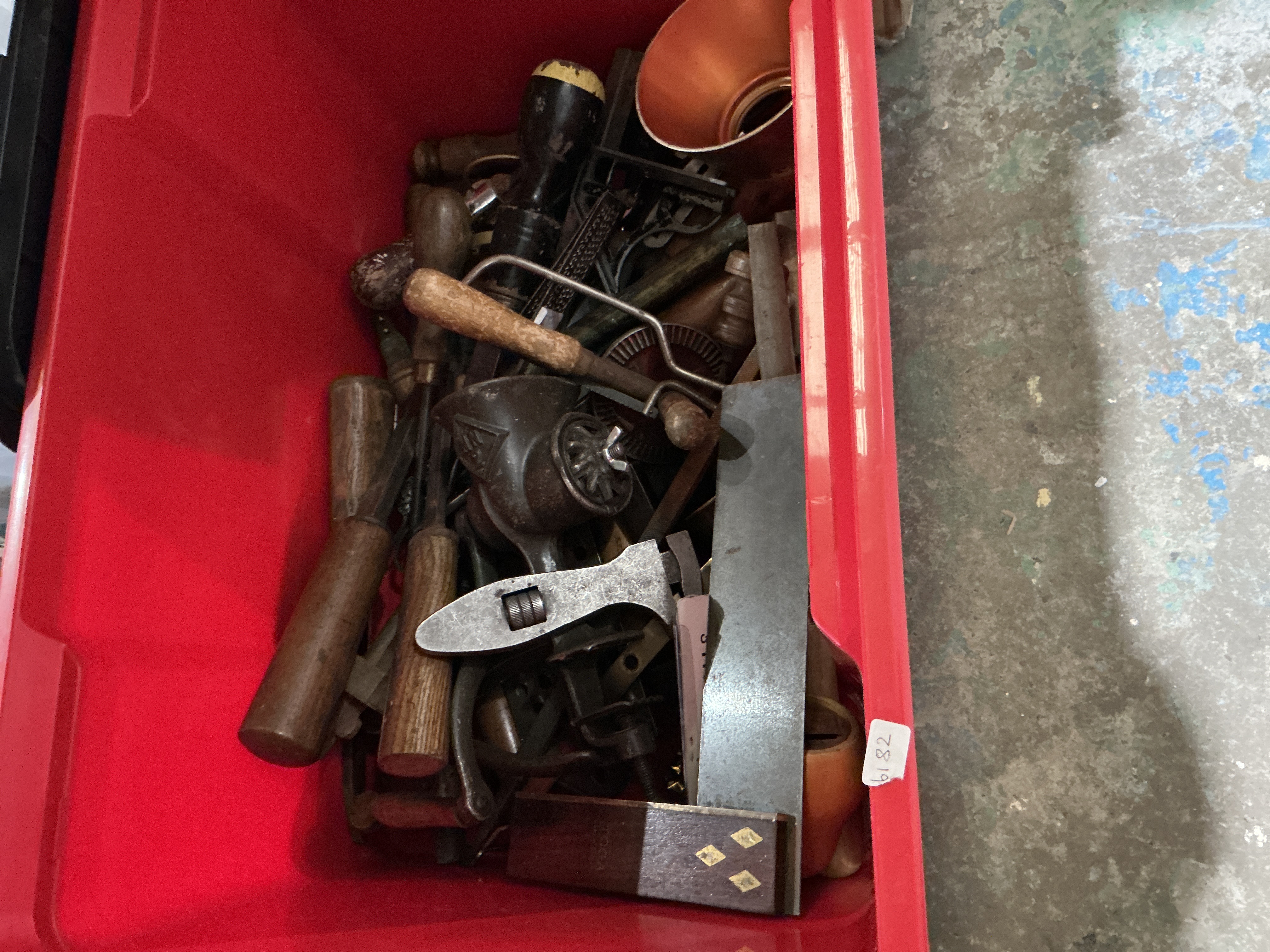 Various Makers, A Collection of Vintage Hand Tools and Woodworking Implements, various manufacturers, late 19th to mid-20th century, mixed materials. This lot comprises a diverse assortment of manual hand tools housed in a red plastic storage bin. The collection includes several wood chisels with turned wooden handles, a cast iron manual food and meat grinder, a vintage adjustable wrench, a coping saw frame, and an eggbeater style manual hand drill. A notable inclusion is a woodworking try square featuring a steel blade and a dark wood handle embellished with three decorative brass diamond-shaped inlays.