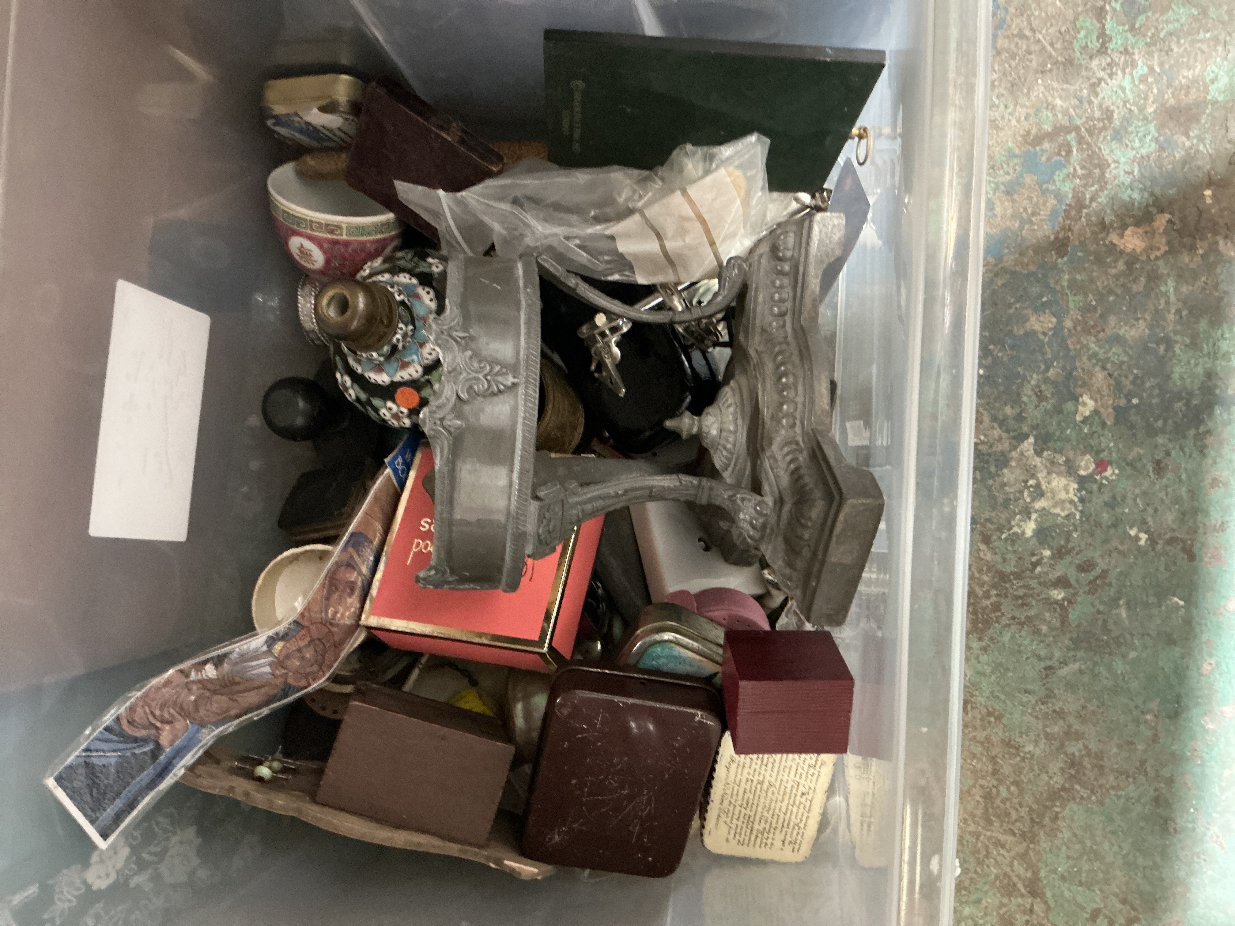 A diverse assortment of decorative collectibles and household ephemera. The lot features a substantial silver-toned metal stand, possibly a lamp base or display plinth, decorated with classical acanthus leaf motifs and beaded scrollwork. Also included is a small Chinese porcelain bowl featuring a pink floral border and the longevity character, alongside a decorative jar with vibrant enamel-style patterning reminiscent of cloisonne work. The collection further comprises various presentation boxes and storage cases in assorted colours and materials, including a textured burgundy case and a red rectangular box. Paper ephemera is present, notably a bookmark depicting a figure in traditional costume and a small tin with a lithographed lid. The lot is rounded out by several unidentified small items and sundries.