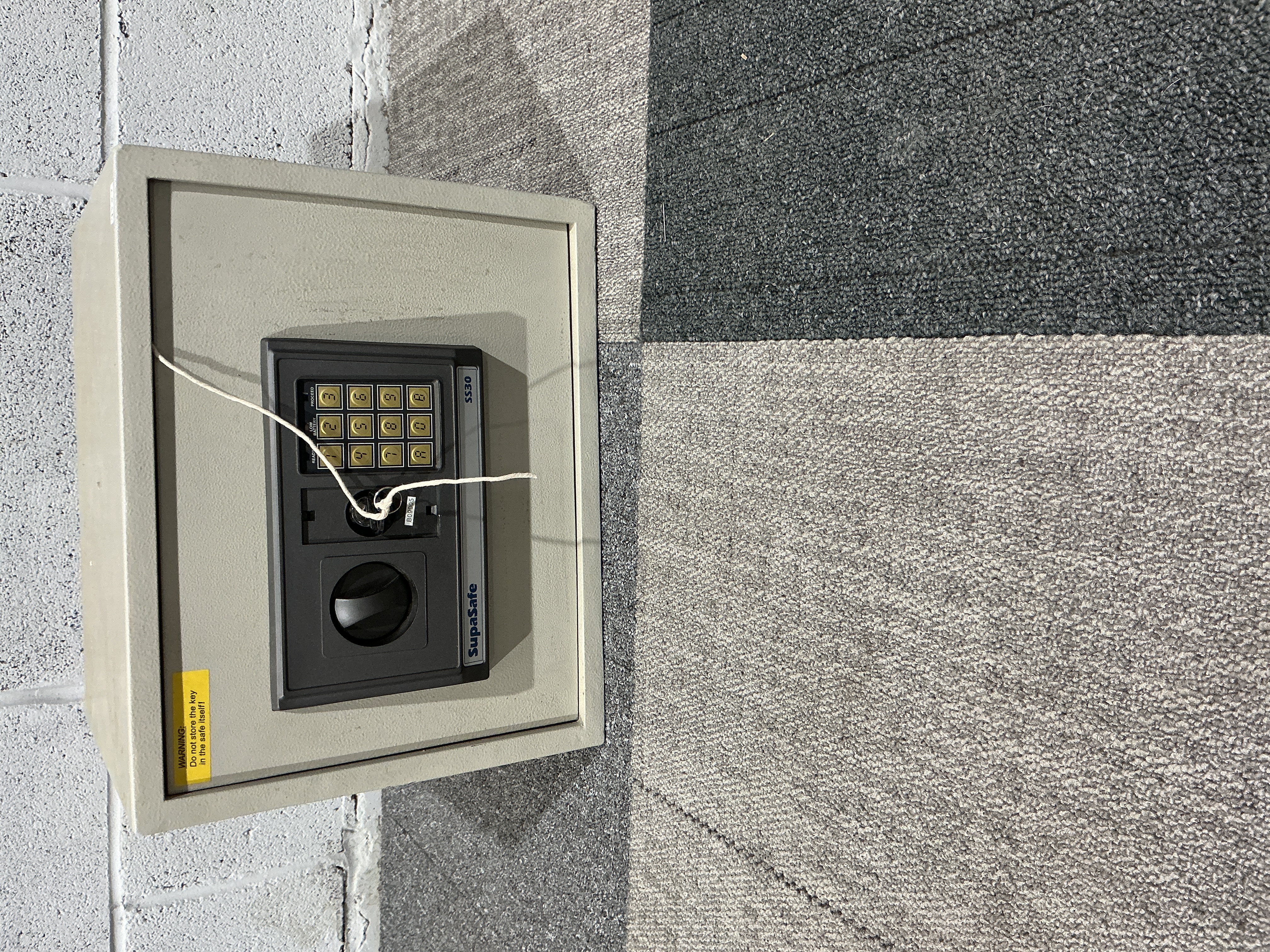 A SupaSafe model SS30 electronic personal safe, constructed from metal with a tan-coloured finish. The unit features a front-mounted black plastic control panel housing a digital numeric keypad and three status indicator lights labelled READY, LOW BATTERY, and PROCEED. It is equipped with a manual key override lock, identified by the label B09005, and a black rotary handle for door operation. A yellow adhesive warning label is affixed to the lower-left corner stating, “WARNING: Do not store the key in the safe itself!”. This model represents a standard security solution for residential or small office use from the early 21st century. Measurements: Dimensions unavailable.