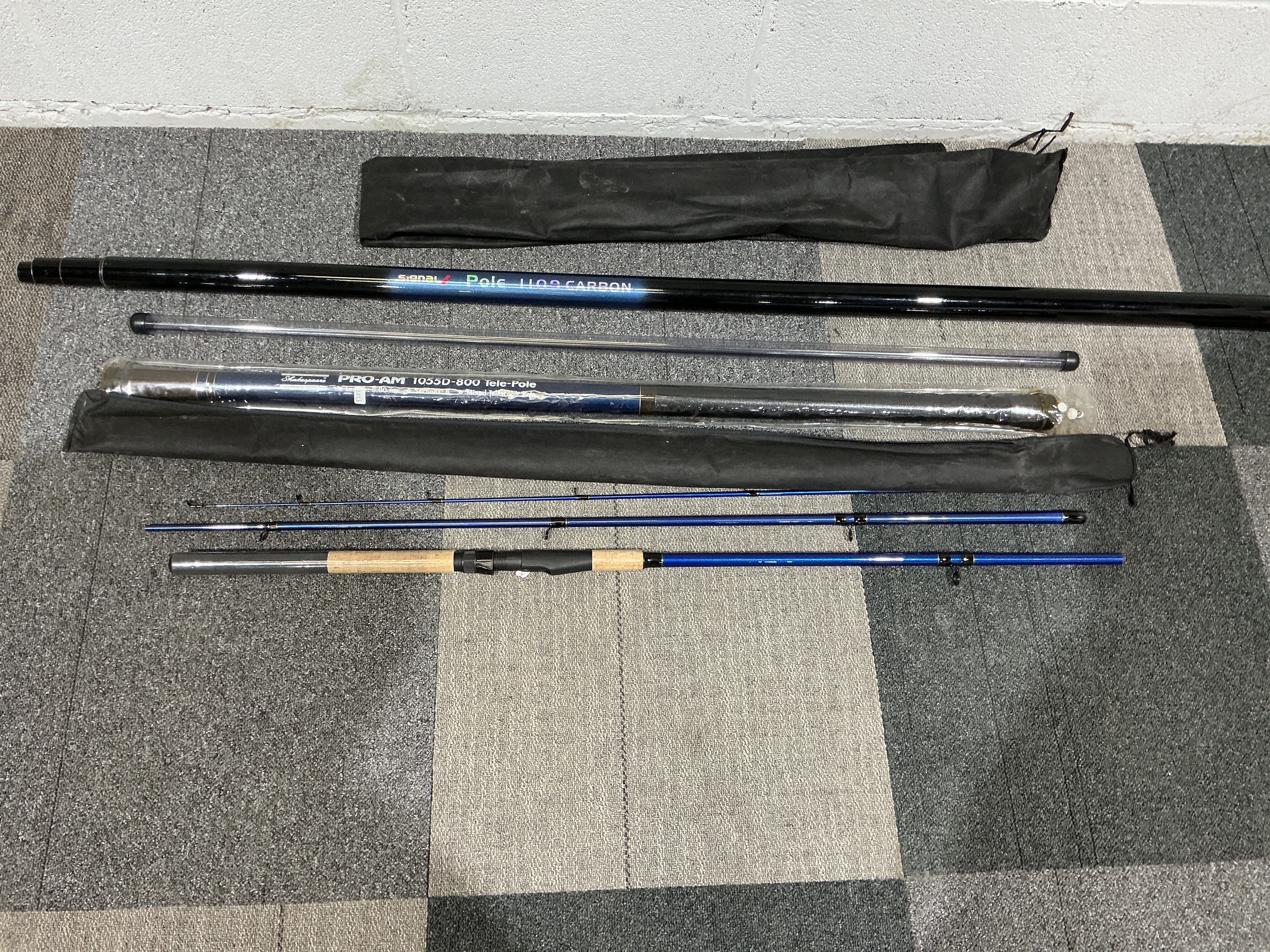 A professional assortment of angling equipment featuring advanced carbon fibre and composite materials. The collection includes a Shakespeare PRO-AM 1055D-800 Tele-Pole, measuring 8.00 metres in length, which retains its original clear plastic protective sleeve. Also present is a black Signal Pole 1100 Carbon, a high-modulus telescopic pole designed for competitive or coarse fishing. The set is further enhanced by a blue-finished three-piece fishing rod featuring a classic cork grip handle and an integrated reel seat. For protection and transport, the lot includes two black fabric carrying sleeves and a clear plastic protective tube. These items represent the transition to lightweight, high-tensile materials in modern angling.