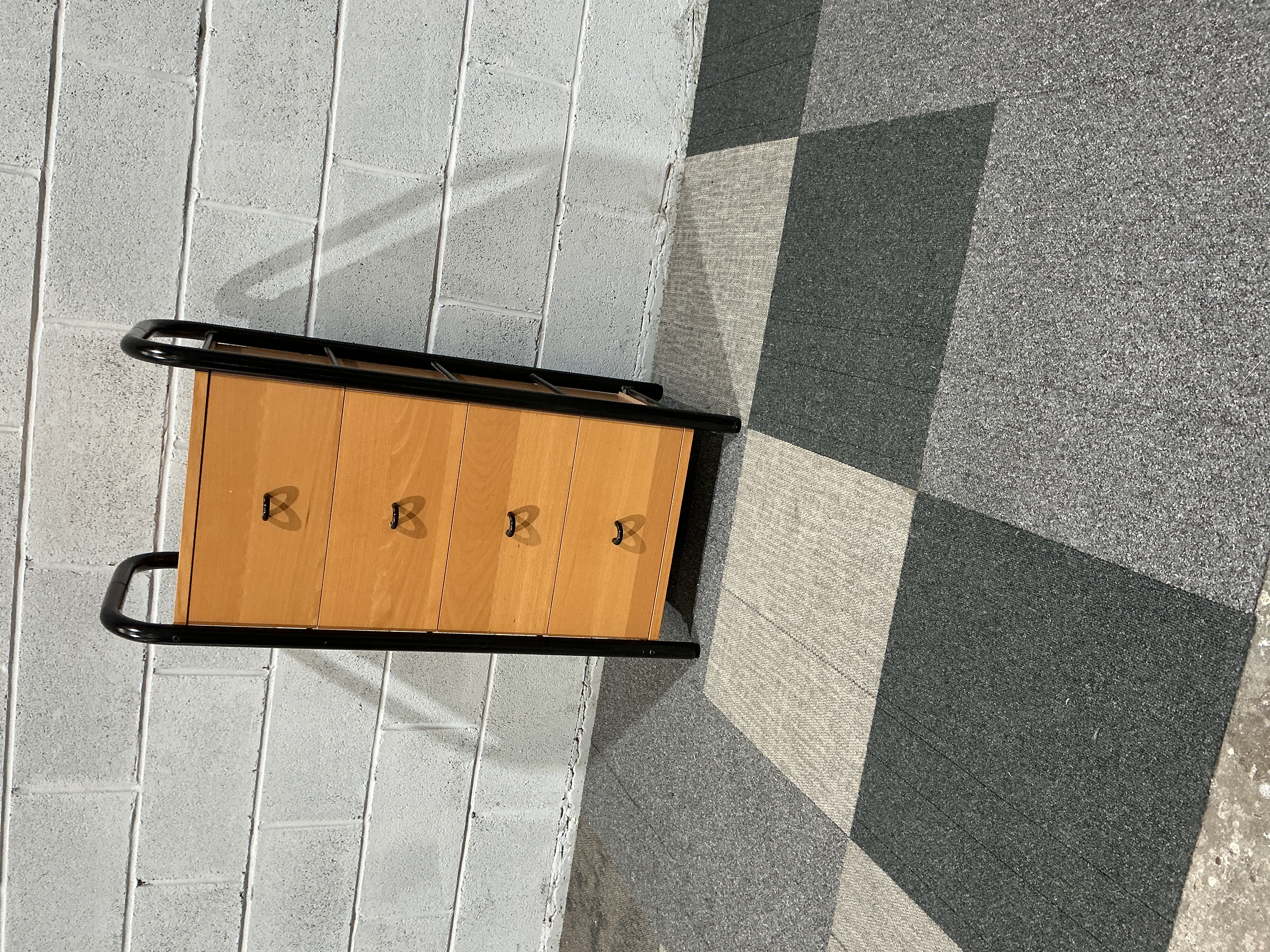 A contemporary storage chest of vertical form, featuring four drawers housed within a black-painted tubular metal frame. The frame is designed with continuous side rails that curve at the top to provide integrated handles. The drawer fronts are finished in a light-toned wood-effect veneer, resembling beech. Each drawer is equipped with a single, centrally mounted black metal D-loop handle. This piece is characteristic of late 20th-century utility furniture designed for domestic or office use. The internal construction of the drawers is not visible, though the design suggests modern mass-production techniques.