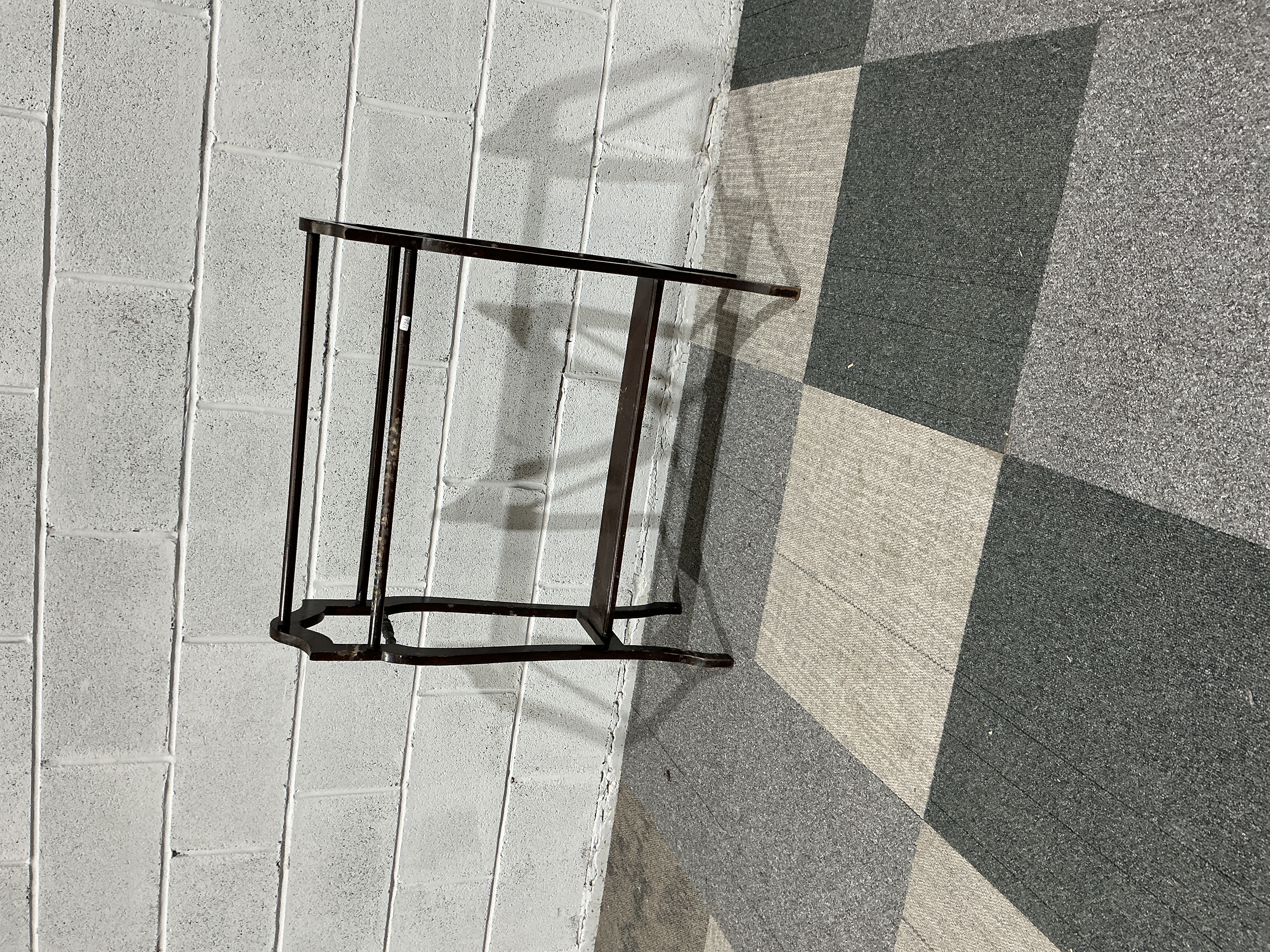 A Victorian style towel rail constructed from dark-stained mahogany. The piece features four horizontal turned hanging rails supported by two shaped uprights. The frame is raised on trestle-style feet joined by a low stretcher. There are no visible maker’s marks or stamps; a small white auction lot label is adhered to one upright.