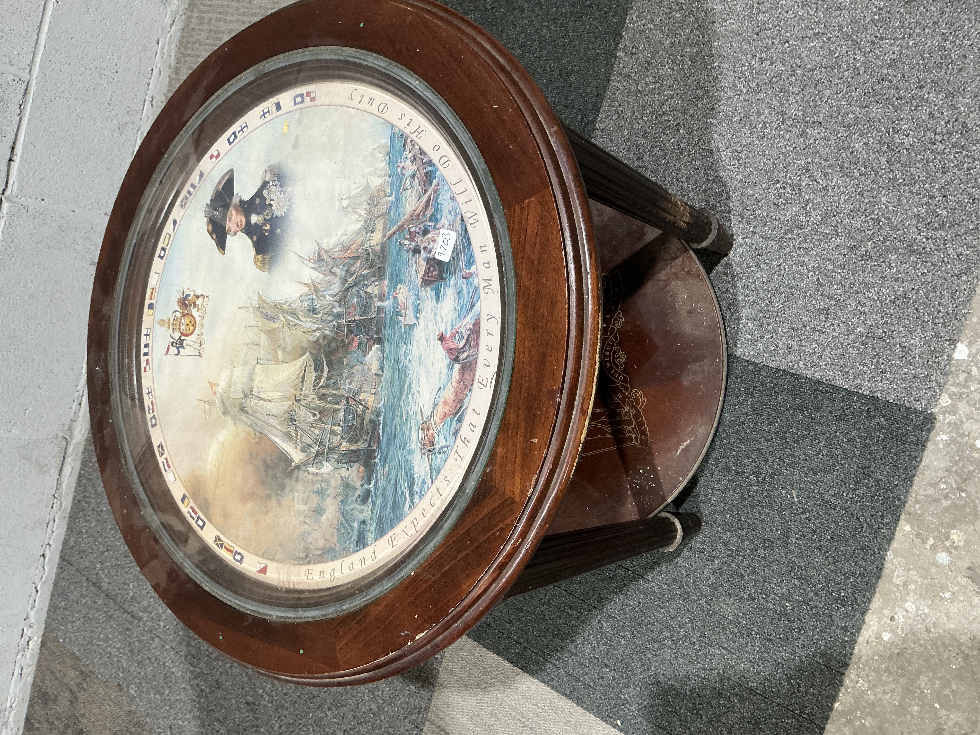 A Danbury Mint The Trafalgar side table, designed in a reproduction Regency style with a mahogany-finished frame. The circular top contains an inset glass panel over a printed commemorative scene depicting Vice-Admiral Horatio Nelson and the Battle of Trafalgar. The perimeter of the print is decorated with maritime signal flags and the inscription England Expects That Every Man Will Do His Duty. The structure is supported by three reeded legs joined by a circular undertier. The undertier features a gilt-effect transfer of Lord Nelson’s coat of arms, including the mottoes Palmam qui meruit ferat and Tria Juncta In Uno.