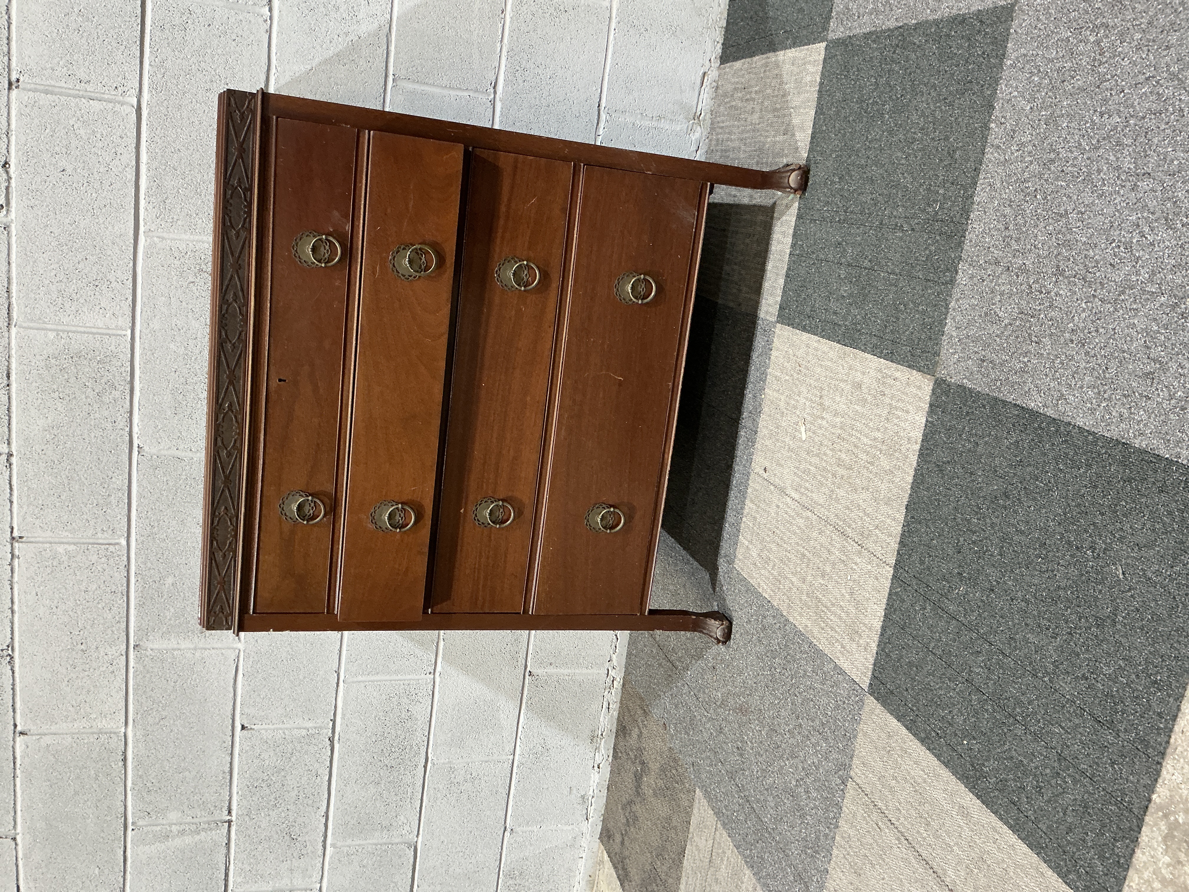 A small mahogany chest of drawers in the George III taste, constructed in the 20th century. The piece is designed as a bachelor’s chest with a four-drawer appearance. The top features a blind-fret carved border and is hinged, lifting to reveal a shallow internal storage compartment. The uppermost drawer front is fixed and integrated into the lift-lid assembly. Below the compartment are three functional full-width drawers. The chest is fitted with decorative brass ring pulls on circular, pierced backplates. The structure is raised on four cabriole legs terminating in pad feet. Primary timber is mahogany; secondary timbers are not fully visible but appear to be of 20th-century manufacture. Internal drawer joinery is not visible.