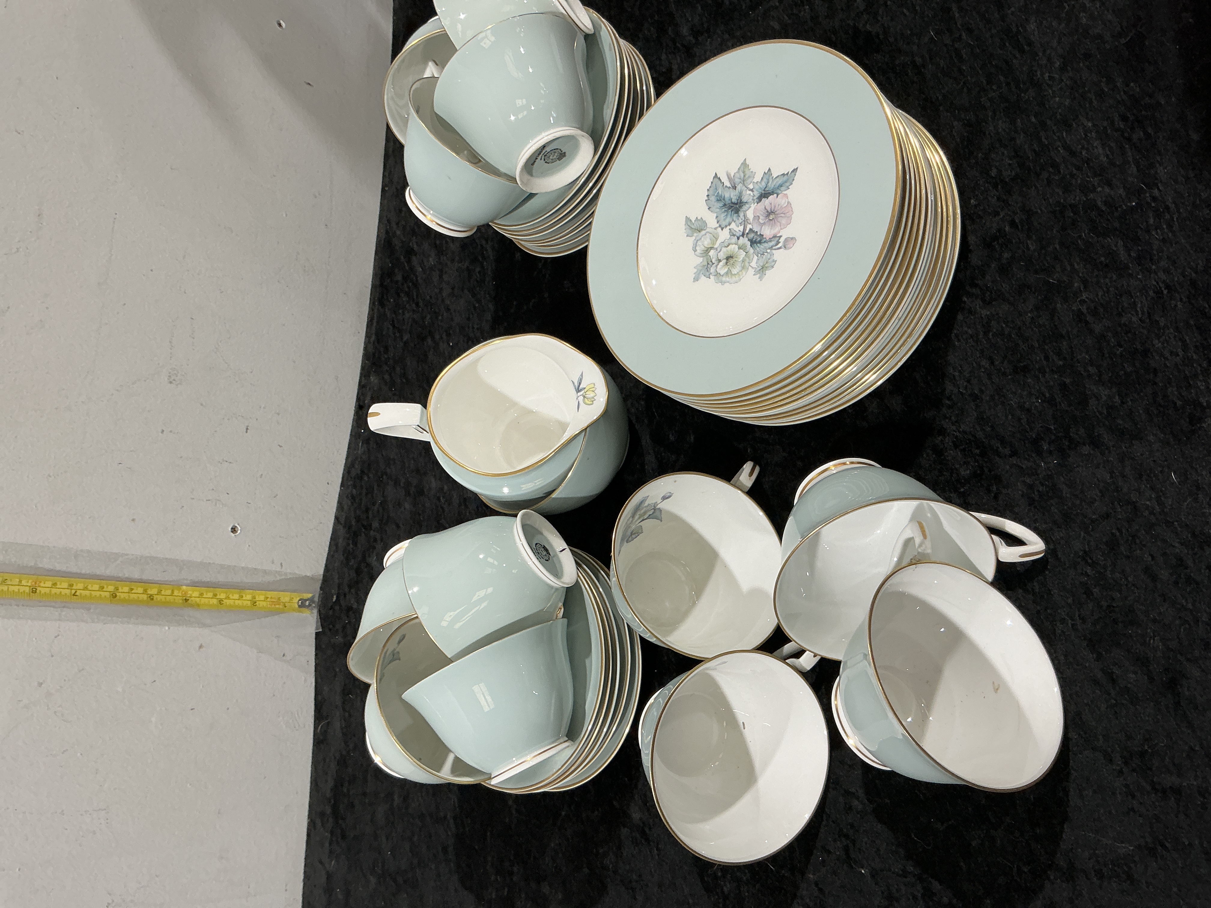 A Royal Doulton bone china tea and side service in the Woodland pattern. The service features a pale duck-egg blue border to the plates and saucers, with a matching colour applied to the exterior of the teacups. The centres of the plates and the interiors of the cups are decorated with transfer-printed floral sprays depicting pansies and other blossoms in muted tones of blue, pink, and yellow with green foliage. Each piece is finished with a gilded rim and gilt accents to the handles. The service comprises a collection of side plates, matching saucers, teacups with flared rims and pedestal bases, and a matching milk jug. The underside of the pieces bears the Royal Doulton manufacturer’s mark and the pattern name Woodland.