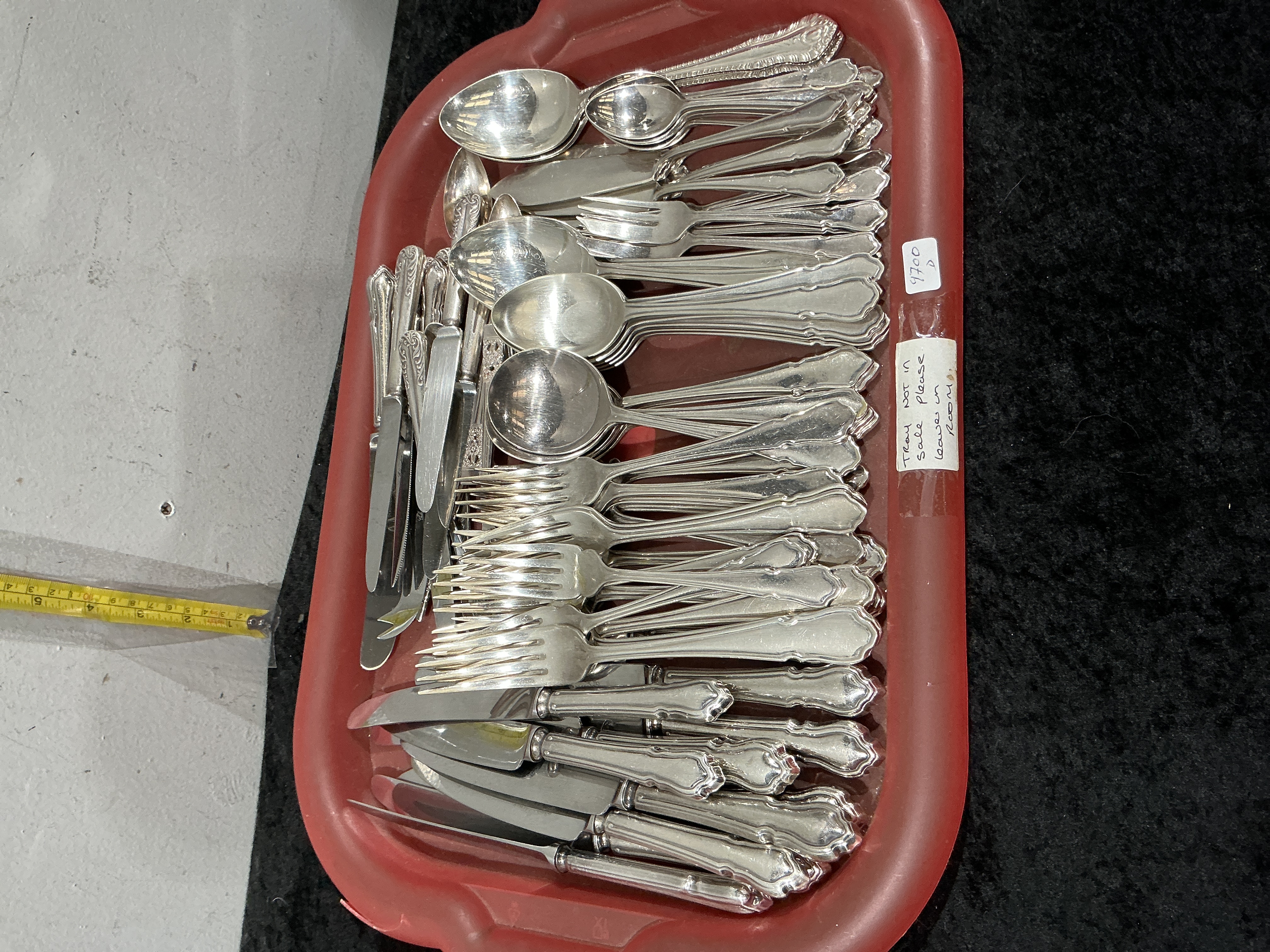 A collection of silver-plated flatware in the Kings pattern, featuring the characteristic shell and scroll-decorated handles. The service includes various pieces such as dinner knives, dinner forks, dessert knives, dessert forks, and an assortment of spoons including tablespoons, dessert spoons, and teaspoons. The knives are designed with shaped handles and stainless steel blades. The items are manufactured from silver-coloured metal and do not bear visible hallmarks or maker’s marks, consistent with silver-plated production. This pattern is closely associated with makers such as Rogers and International Silver. The red plastic tray shown in the image is not included in the lot.