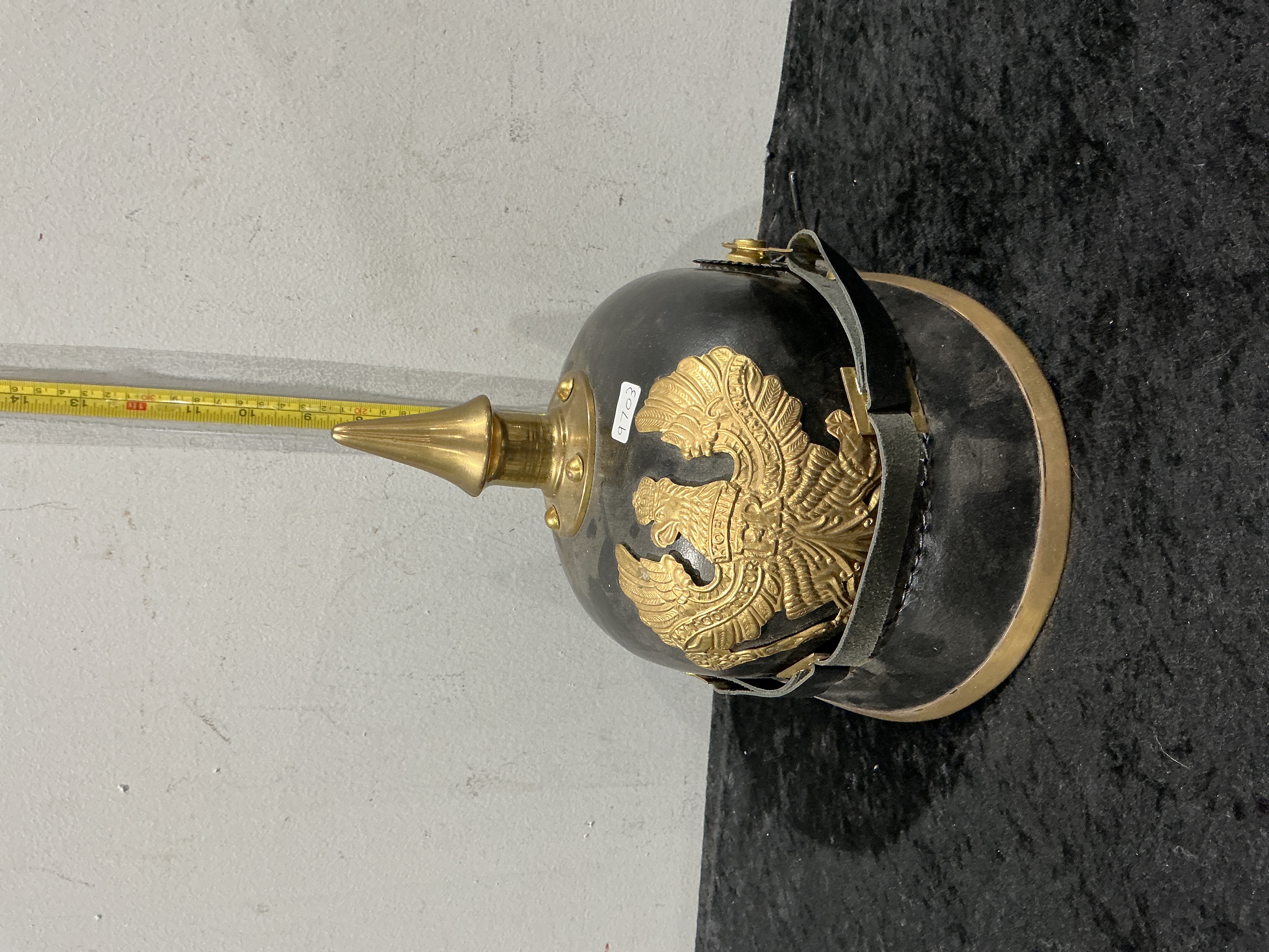 A replica Imperial German Prussian infantry enlisted man’s spiked helmet, known as a Pickelhaube. The helmet is constructed with a blackened leather shell and fitted with brass furniture. The front features a brass Prussian line eagle helmet plate (wappen) with spread wings, holding a sceptre and orb. The banner draped across the eagle’s breast and wings carries the motto Mit Gott Für Koenig Und Vaterland. The helmet is topped with a smooth brass spike mounted on a circular base plate, which is secured to the crown by four brass domed rivets. The piece includes a brass-edged front visor and a brass spine running down the rear. It retains two serrated cockades: the National (Reich) cockade in red, white, and black on the wearer’s right, and the Prussian state cockade in black and white on the wearer’s left. A black leather chinstrap with brass sliders is attached to the side lugs. An adhesive lot label with the handwritten number 9703 is present on the front left of the shell.
