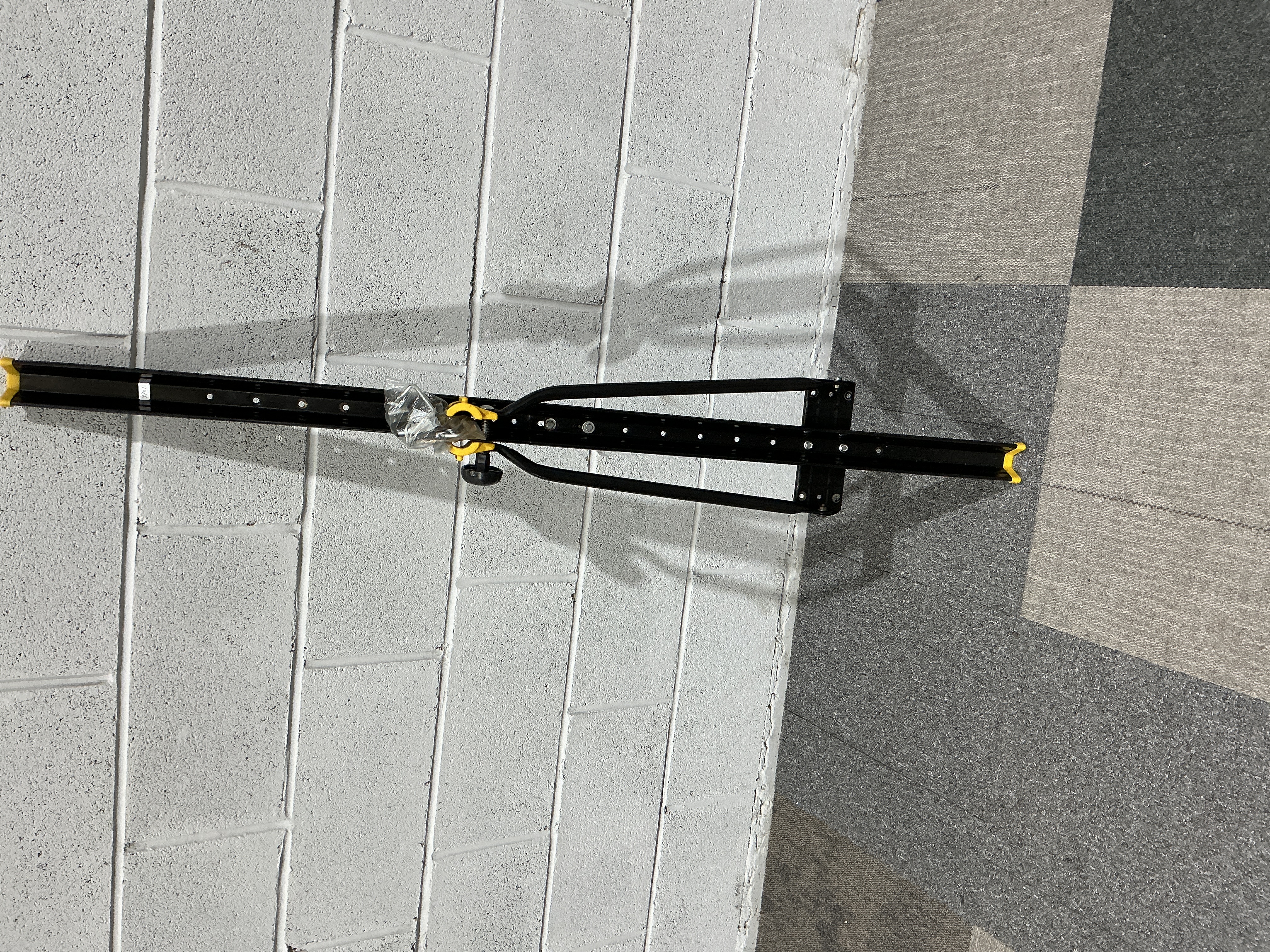 This item is identified as a Lippert Jack-It BikeWing double bike rack component, consistent with the 429756 model. The unit consists of a long, black perforated metal rail designed for use as a bike rack. It features yellow plastic end caps and a central clamping mechanism, which remains partially wrapped in original clear plastic. A U-shaped support bracket is secured to one end of the rail. A small white adhesive label with the characters 108 is present on the rail. No manufacturer brand name or model number is visible on the body of the item. The full assembly of this model typically retails for approximately 180.
