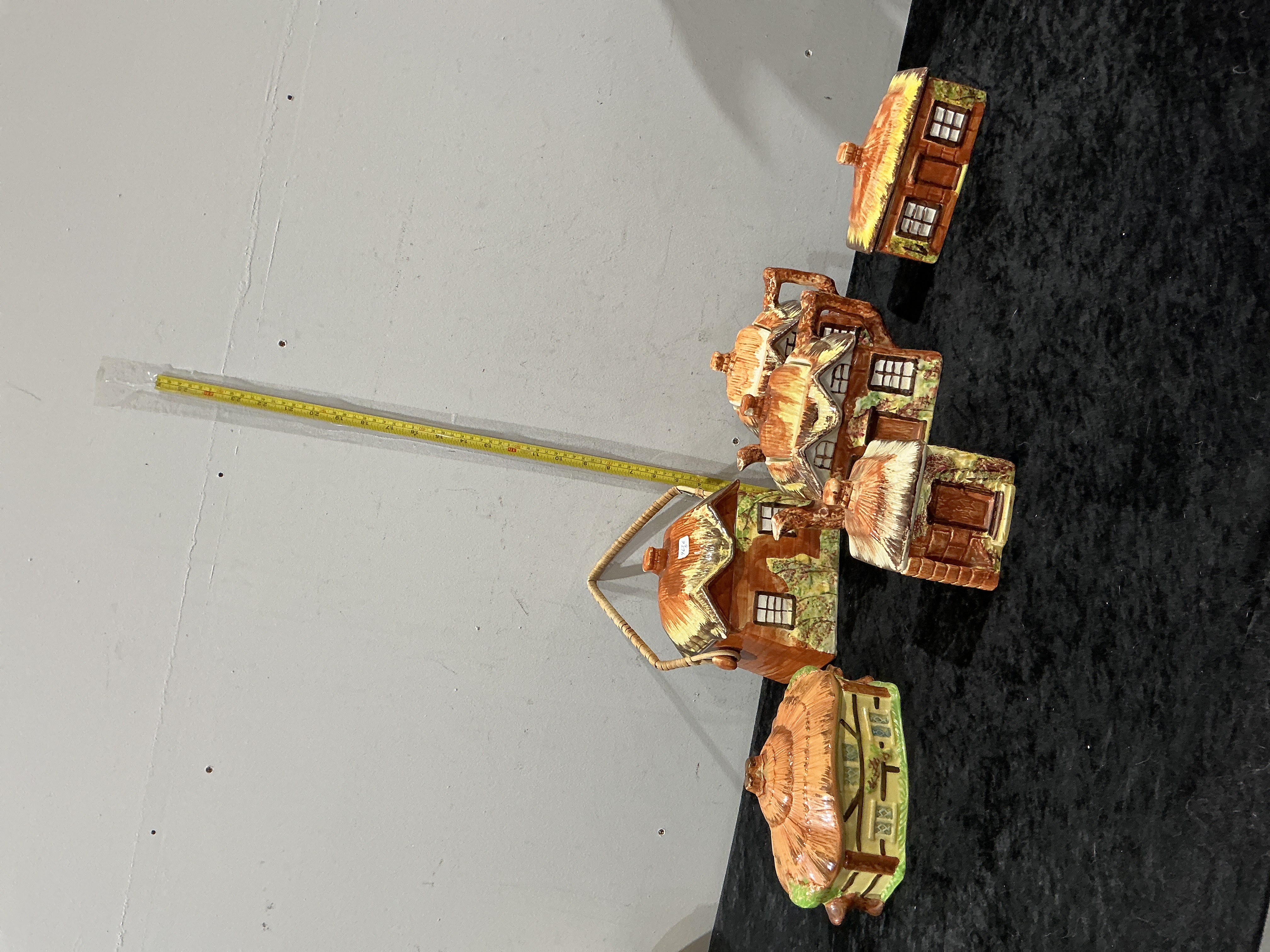 A five-piece collection of decorative Cottage Ware table items, in the style of English manufacturers such as Price Kensington or Ye Olde Cottage. The set is constructed from slip-cast glazed earthenware, designed in novelty architectural forms representing traditional English thatched cottages. Each piece features moulded relief details including thatched roofs, timber framing, windows, and garden foliage, finished with polychrome hand-painted decoration in a palette of brown, ochre, and green. The collection includes a teapot with a separate lid and an overhead wicker-effect ceramic handle, a lidded biscuit barrel, a water or milk jug with a ceramic handle, a rectangular lidded dish, and a smaller lidded pot. No maker marks are visible on the bases or bodies of the items.