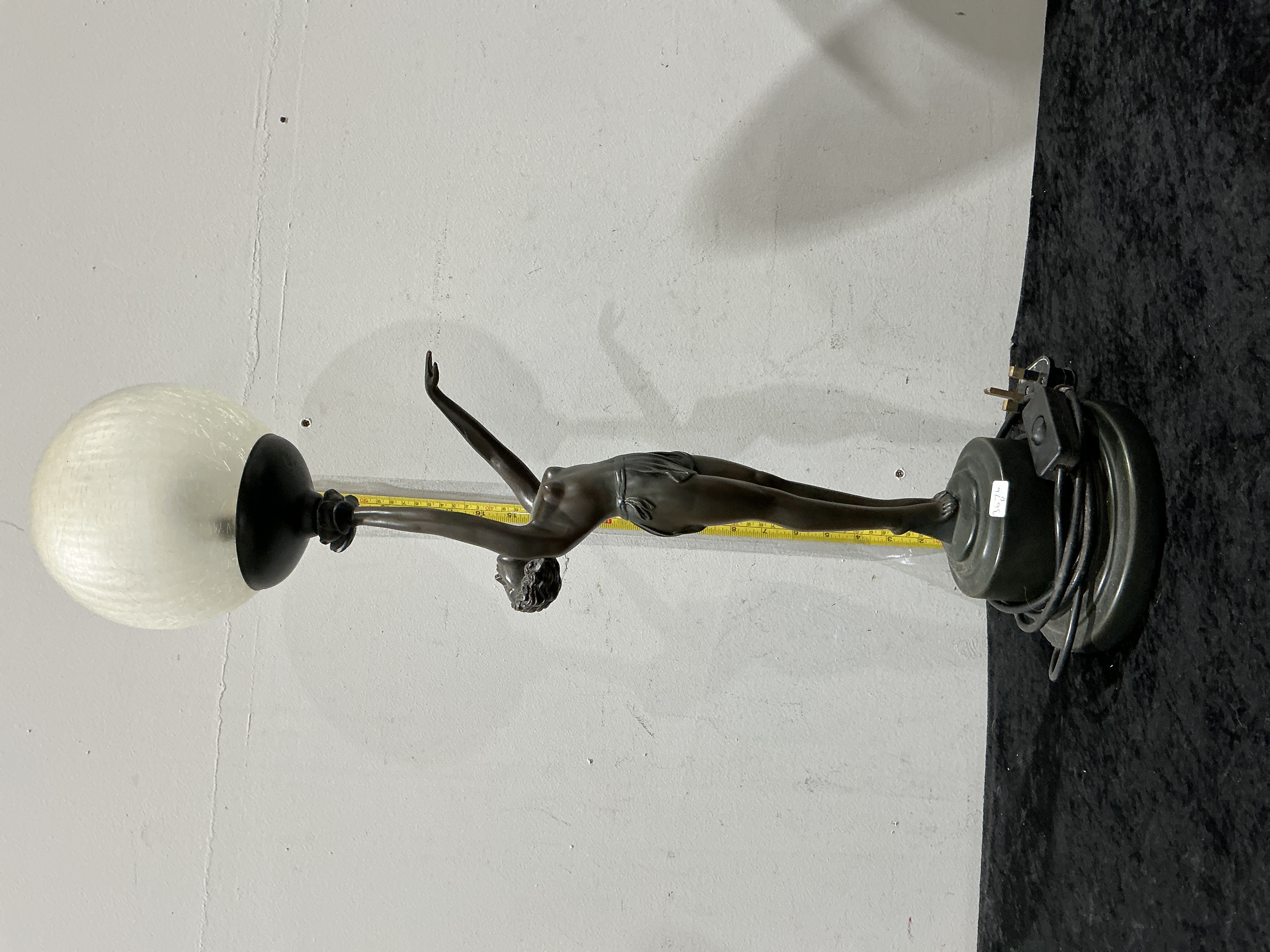 An Art Deco style sculptural table lamp featuring a cast metal figure of a female dancer in a dynamic arching pose. The figure is finished with a dark bronze-effect patina and supports a spherical frosted glass globe shade with a faint textured pattern. The sculpture is mounted upon a two-tiered circular base. The lamp is fitted with a modern black cord, an in-line thumb switch, and a standard UK three-pin plug. No maker’s marks, signatures, or foundry stamps are visible on the base or the figure. This item is sold for decorative purposes only and has not been tested for electrical safety; it must be inspected and tested by a qualified electrician prior to use.