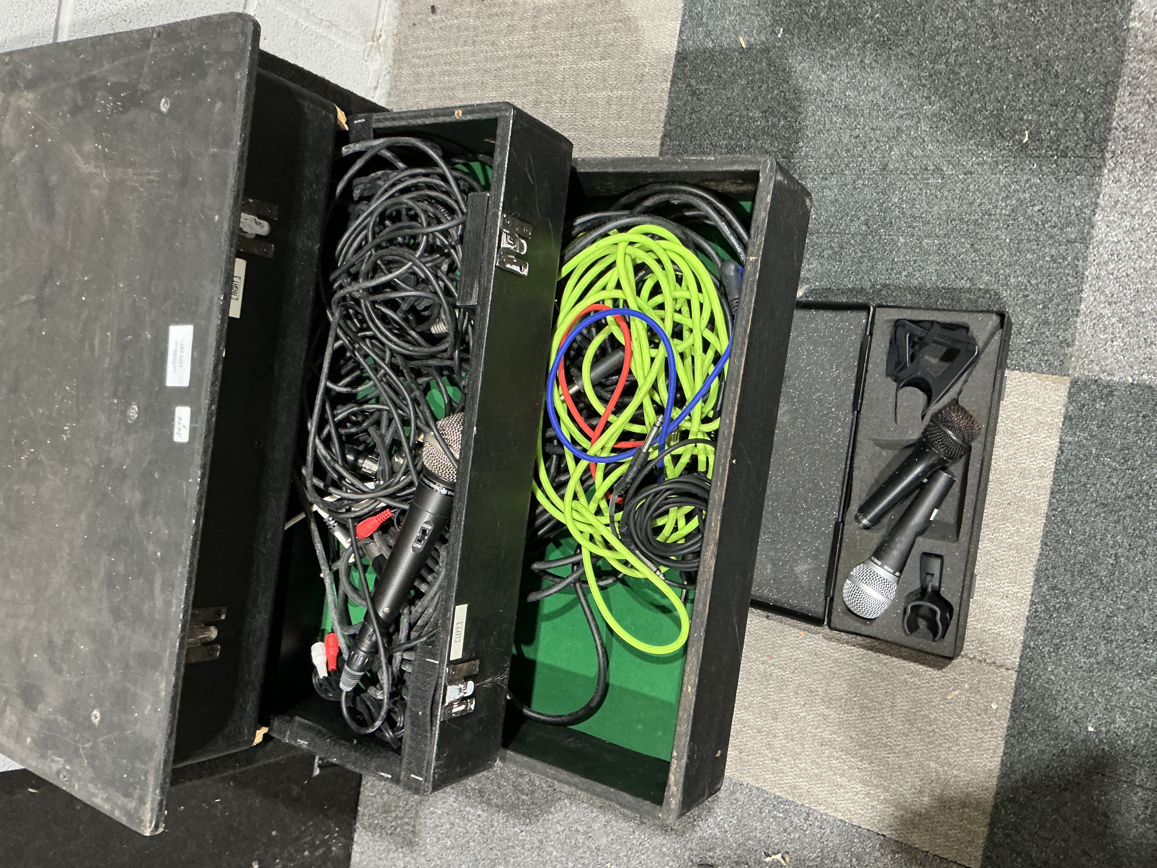 A collection of professional audio equipment and accessories, housed within two black-painted wooden storage cases with green felt lining and an additional foam-lined microphone tray. The lot includes several handheld dynamic microphones; one microphone is marked SHURE SM58, while others bear the mark DYNAMIC. The collection features a large quantity of assorted audio cabling, including black XLR and RCA leads, alongside high-visibility neon green, blue, and red cables. Multiple microphone stand clips are also included in the foam tray. The wooden cases feature various adhesive labels, including directional indicators LEFT and RIGHT and an auction house sticker for LOT 187.