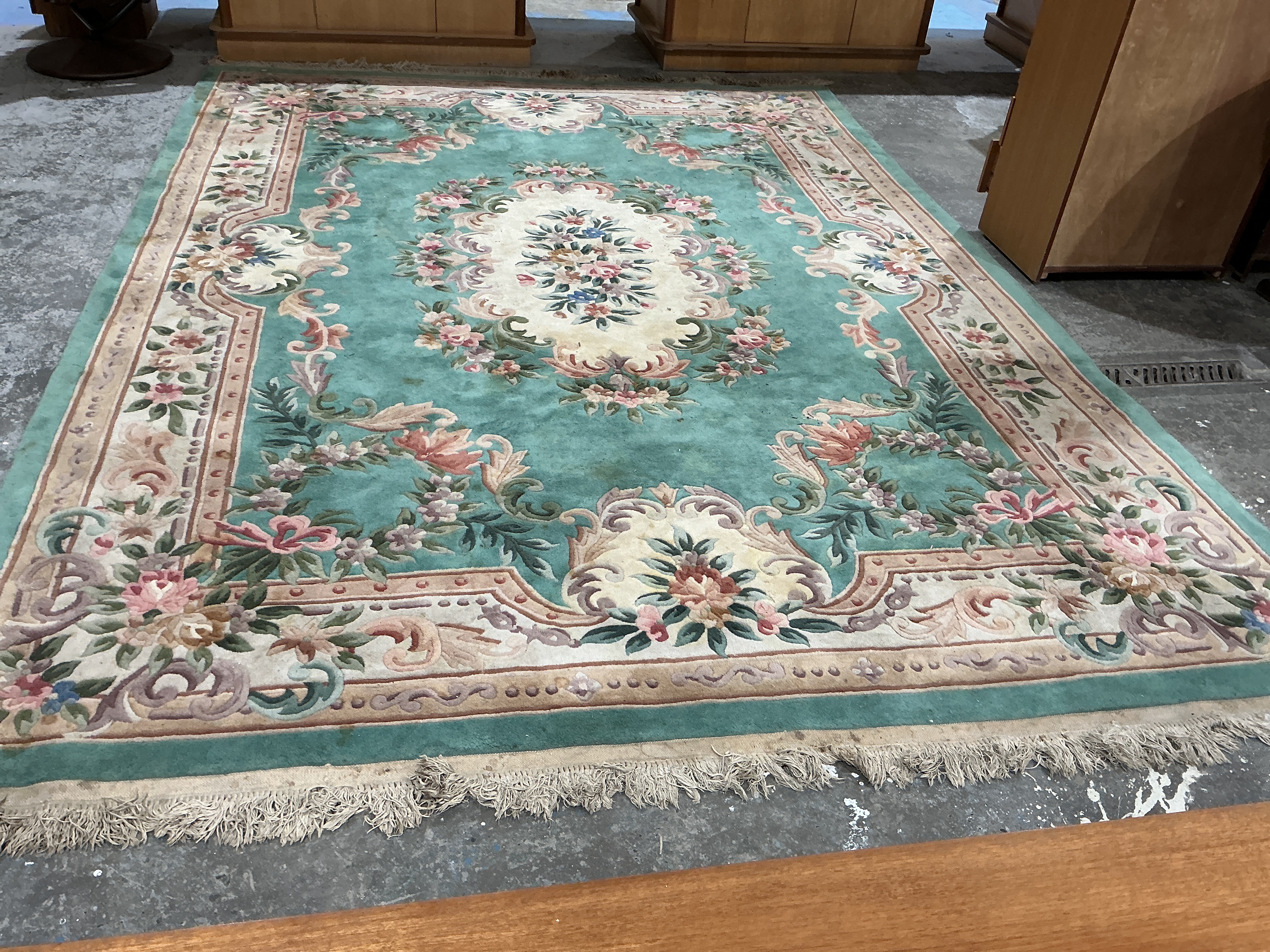 This rectangular Chinese carpet is constructed with a wool pile on a cotton foundation, following an Aubusson-inspired design. The central field is a seafoam green, dominated by a large ivory-ground oval medallion featuring a multi-coloured floral bouquet. This central motif is mirrored by four smaller floral cartouches at each corner, all interconnected by scrolling foliate and floral swags. The carpet is framed by a complex, multi-layered border. An inner cream-coloured border with a continuous floral vine is followed by a broader outer border featuring ornate scrollwork and additional floral sprays in shades of rose, peach, blue, and sage green. The pile is thick and dense, with hand-sculpted detailing around the floral elements to provide depth and texture.