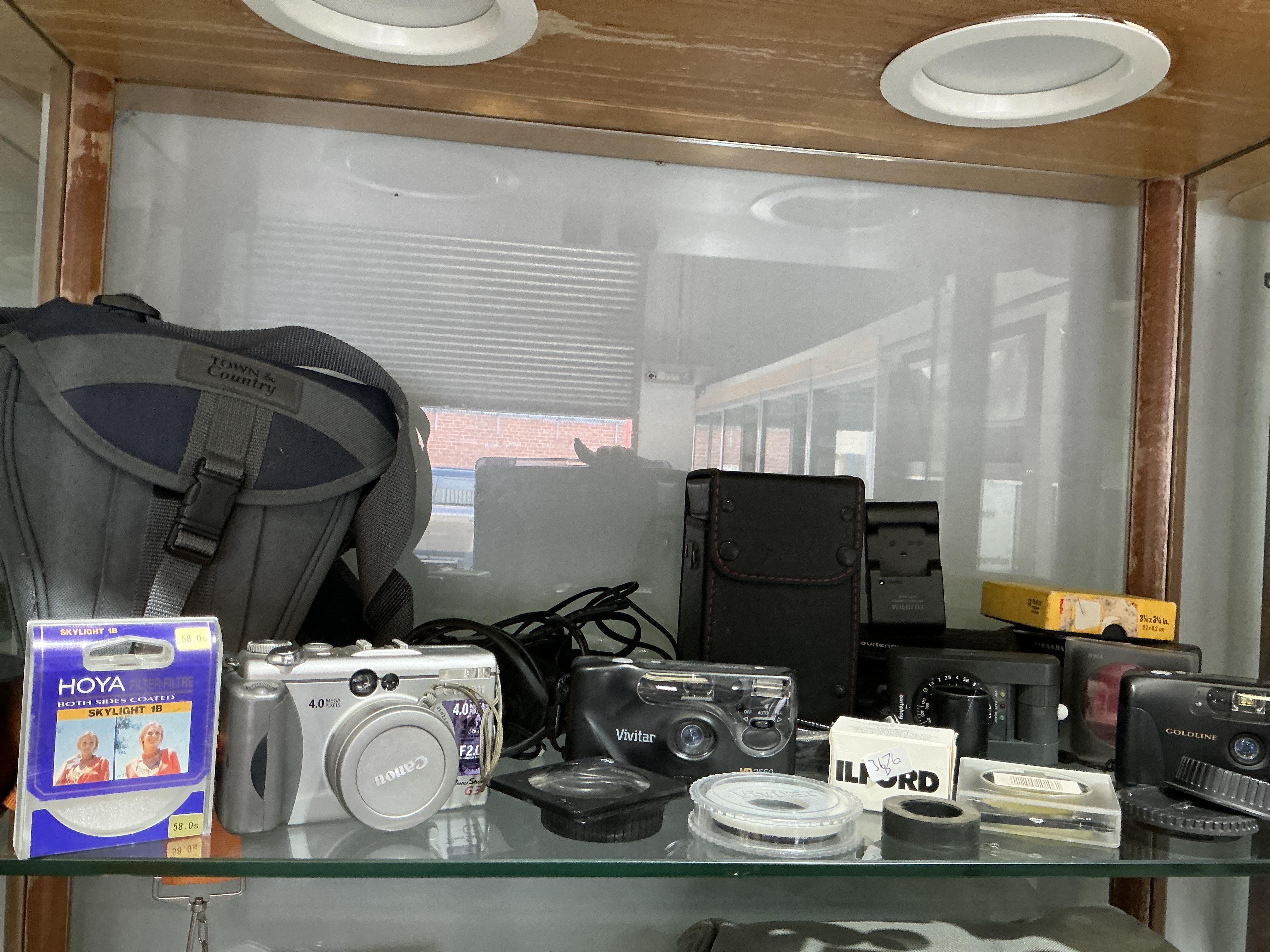 This collection of photographic equipment features a Canon PowerShot G3 digital compact camera, a Vivitar VP3550 35mm film camera, and a Goldline compact film camera. The Canon PowerShot G3 is finished in silver and is marked as a 4.0 mega pixel model, featuring a hot shoe for external flash and a Canon branded lens cap. The Vivitar VP3550 is a black plastic point-and-shoot film camera with a sliding lens cover and integrated flash. The Goldline camera is a black plastic point-and-shoot model with gold-tone lettering. The items are housed in a Town & Country grey and blue textile shoulder bag with adjustable straps and plastic clip closures. Accessories include a boxed Hoya 58mm Skylight (1B) filter, an Ilford branded box with handwritten markings 3/76, and a yellow cardboard box for photographic paper. The lot also contains several unboxed lens filters in circular plastic cases, a black leatherette camera case, a black plastic lens hood, various lens caps, and assorted connection cables.