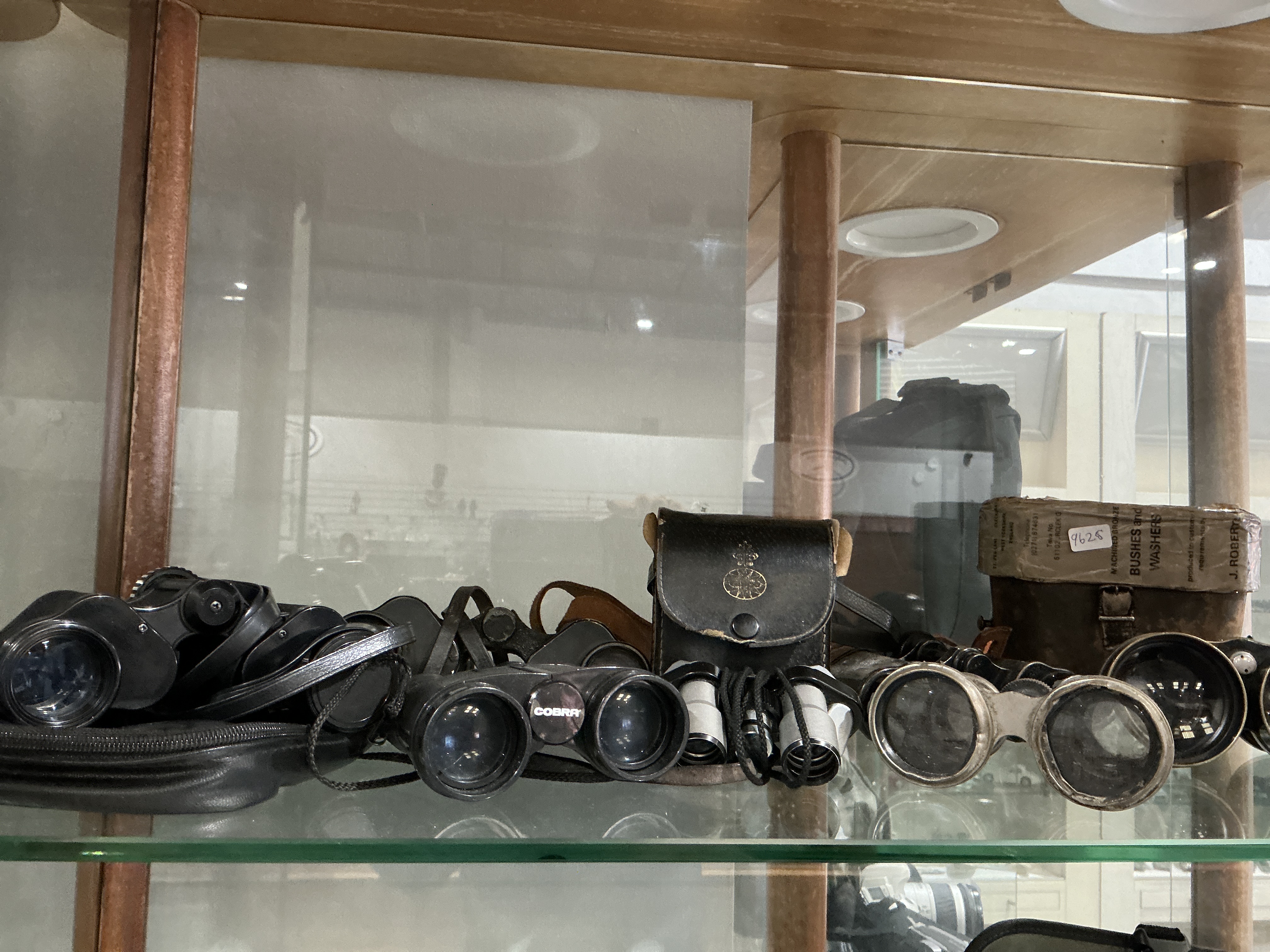 This collection comprises various optical instruments including modern prism binoculars, compact binoculars, and vintage field glasses. One pair of compact binoculars is marked COBRA on the central hinge cap and features a black finish with a cord neck strap. A pair of modern prism binoculars features a black textured body, centre-focus adjustment, and is accompanied by a black padded soft case. The vintage items include a pair of small field glasses with nickel-plated barrels, housed in a black leather pouch gold-stamped with a crest depicting a crown above a circular motif. Also included is a pair of large-aperture field glasses with nickel-plated rims and a black-coated body, stored in a repurposed cylindrical leather industrial case. This case is printed with the text BUSHES and WASHERS, MACHINED BRONZE, and J. ROBERT, and includes a handwritten label numbered 9628.