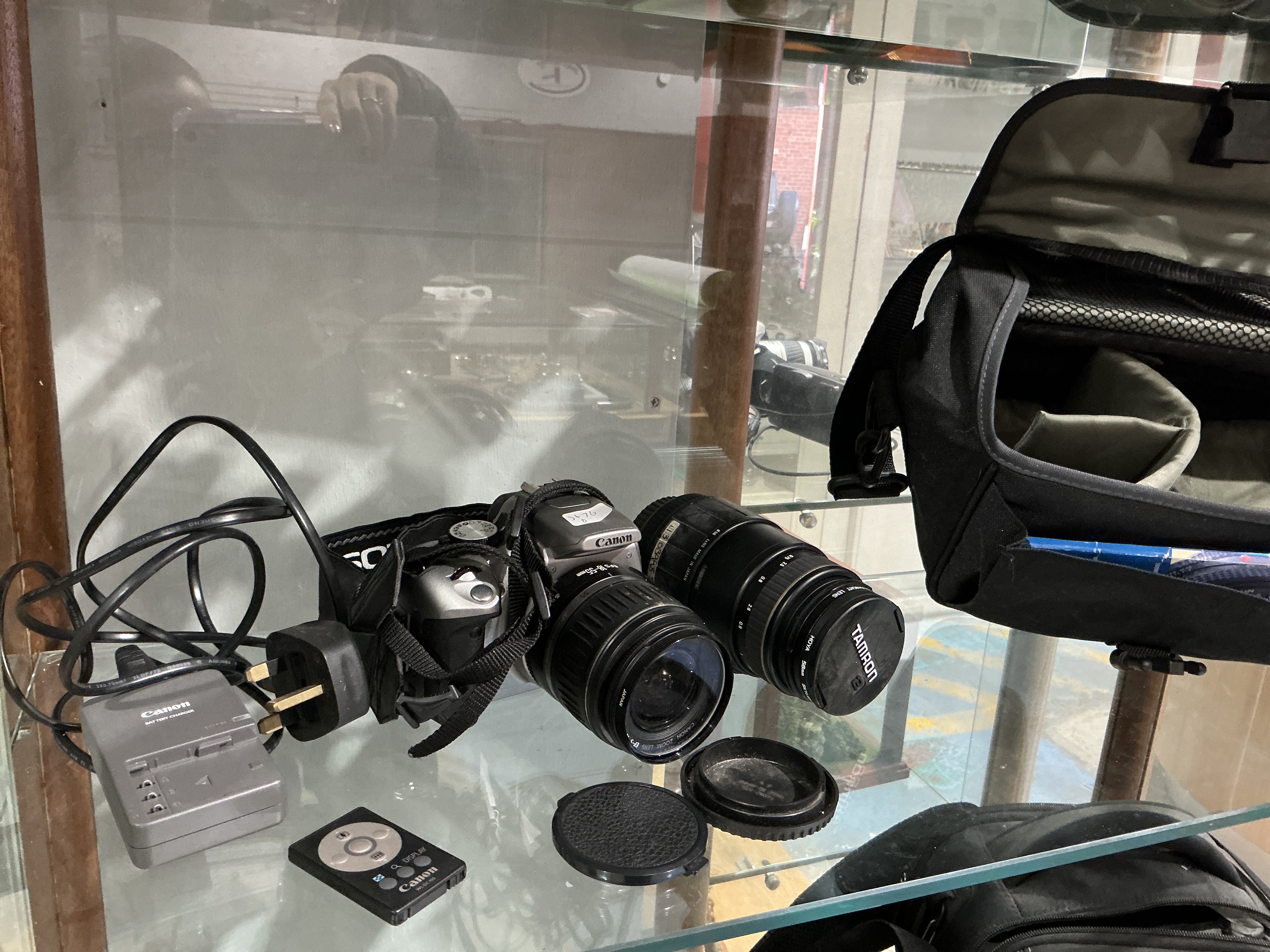 A Canon EOS 300D digital SLR camera kit, also known as the Digital Rebel. The camera body is constructed from polycarbonate with a silver and champagne metallic finish and black rubberised grips. The front fascia is marked with EOS and 300D. The kit includes two lenses: a mounted Canon EF-S 18-55mm f/3.5-5.6 II zoom lens and an additional Tamron zoom lens with a focal range of 28-80mm. The Tamron lens is fitted with a Hoya filter and a Tamron branded front cap. Accessories include a Canon battery charger with a UK 3-pin plug, a Canon WL-DC100 wireless remote controller, a Canon branded black woven neck strap, one Canon-style rear lens cap, one generic cap, and a black nylon padded multi-compartment camera bag.