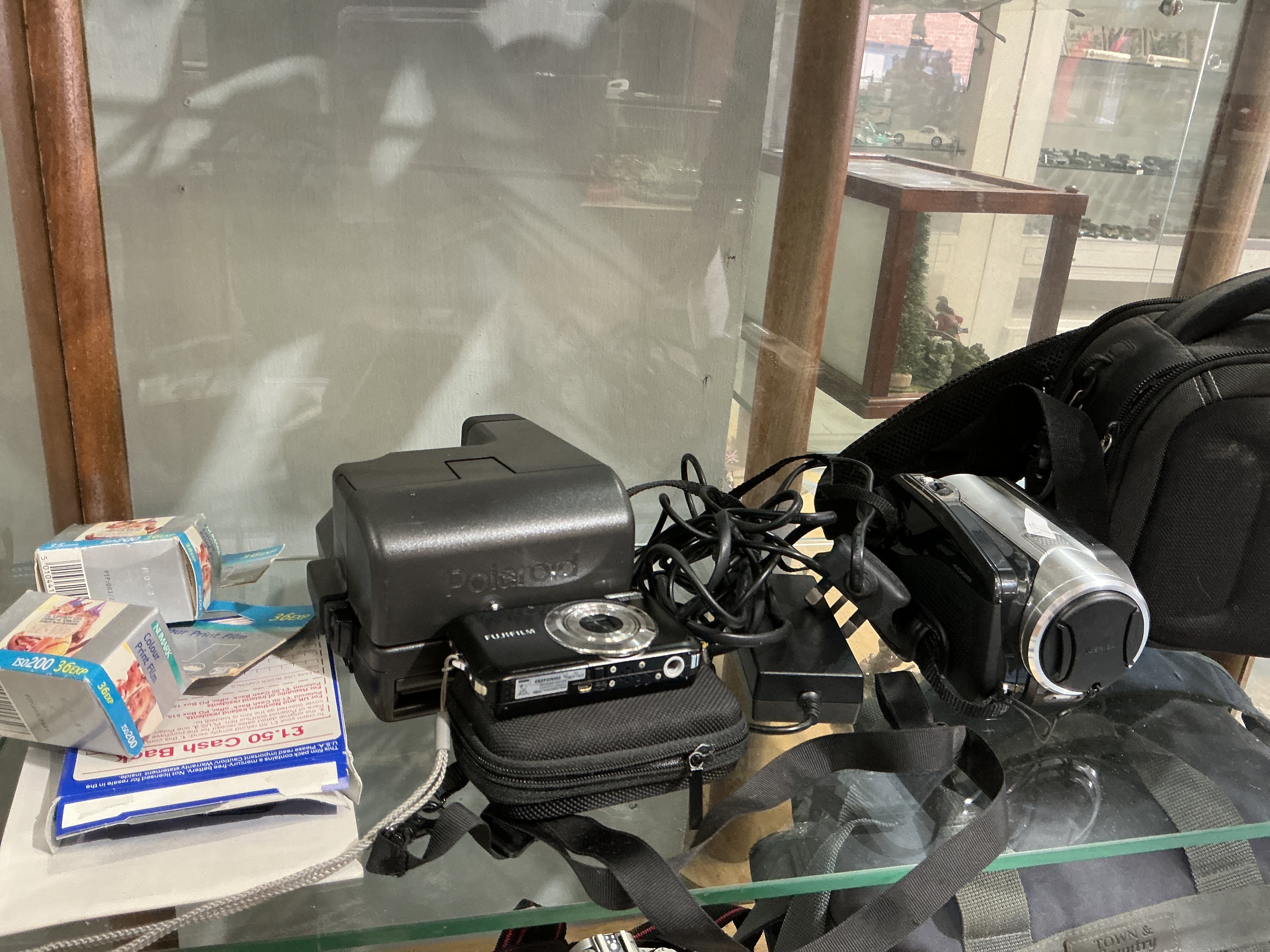A collection of photographic and video equipment featuring an instant film camera, a compact digital camera, and a digital camcorder. The lot includes a black rigid-bodied Polaroid 600-series instant camera with an embossed maker mark to the front housing. Also present is a black Fujifilm compact digital point-and-shoot camera with a silver-tone lens surround, accompanied by a black zippered soft case. The video equipment consists of a silver and black Sony Handycam digital camcorder with a branded lens cap, housed within a black padded nylon shoulder bag. Supporting items include two boxes of Nimark Colour Print Film, 35mm format, ISO 200, 36 exposures, along with related promotional ephemera. A black AC power adapter with a UK three-pin plug and associated cabling is also included.