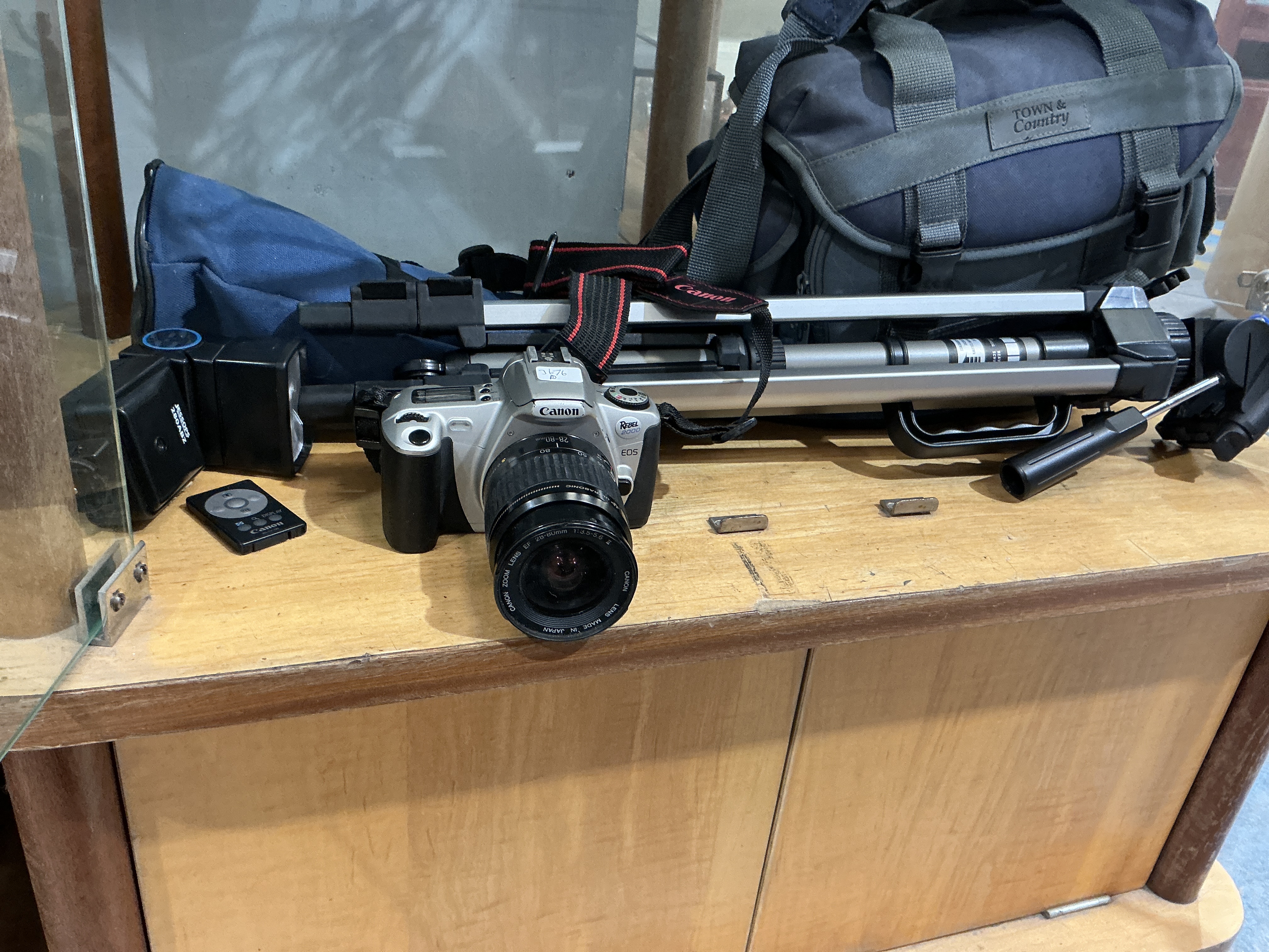 A Canon EOS Rebel 2000 35mm film SLR camera body, which is the North American market designation for the model sold in the United Kingdom and Europe as the EOS 300. The camera is constructed from silver and black polycarbonate and features a built-in pop-up flash, an LCD control panel, and a Canon branded neck strap. It is fitted with a Canon Zoom Lens EF 28-80mm f/3.5-5.6 II, featuring a Canon EF mount and a 58mm filter diameter. The front element ring is marked EF 28-80mm 1:3.5-5.6 II and CANON LENS MADE IN JAPAN. Included with the camera is an assortment of photographic equipment comprising a Sunpak 2000DZ electronic flash unit, a Canon branded wireless remote shutter release, and a lightweight aluminium tripod with a pan-tilt head and black plastic fittings. The lot is accompanied by a Town & Country branded navy blue canvas gear bag and a secondary blue padded tripod case.
