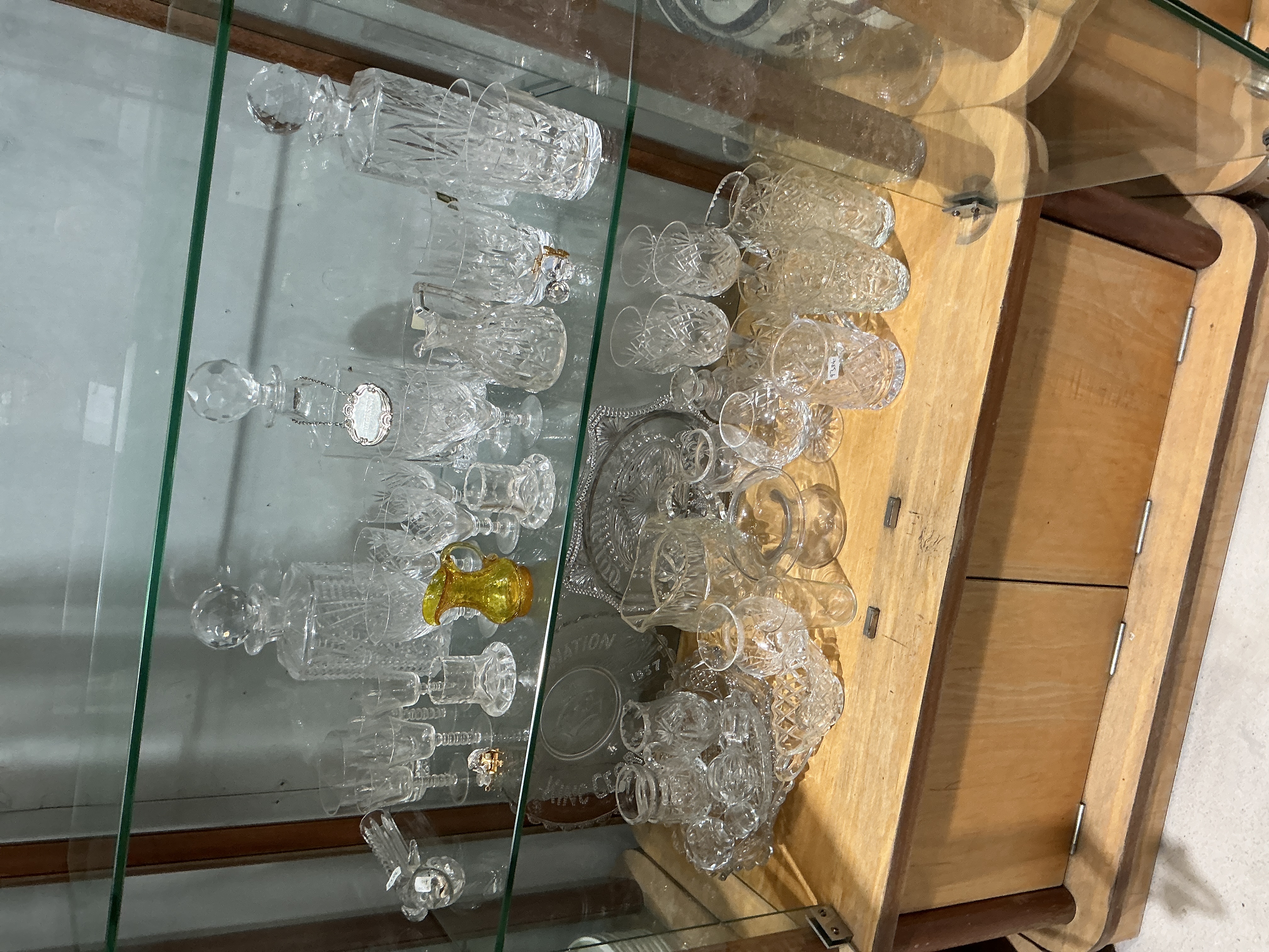 An assortment of cut lead crystal and glassware, predominantly of 20th-century British origin. The collection includes three spirit decanters with multifaceted stoppers, featuring deep-cut diamond and cross-hatch geometric patterns. One decanter is accompanied by a shield-shaped silver-coloured metal label inscribed GIN. The lot further comprises various suites of drinking vessels, including wine glasses, tumblers, and highball glasses, decorated with fan motifs and vertical fluting. One glass bears a small white adhesive label with the handwritten number 9384. A notable inclusion is a circular etched glass plate commemorating the 1937 coronation of King George VI, featuring a central portrait and the inscription CORONATION KING GEORGE VI 1937. Also present is a small amber glass jug. While the style is consistent with makers such as Webb Corbett, Stuart Crystal, and Tudor Crystal, no acid-etched manufacturer marks are discernible.
