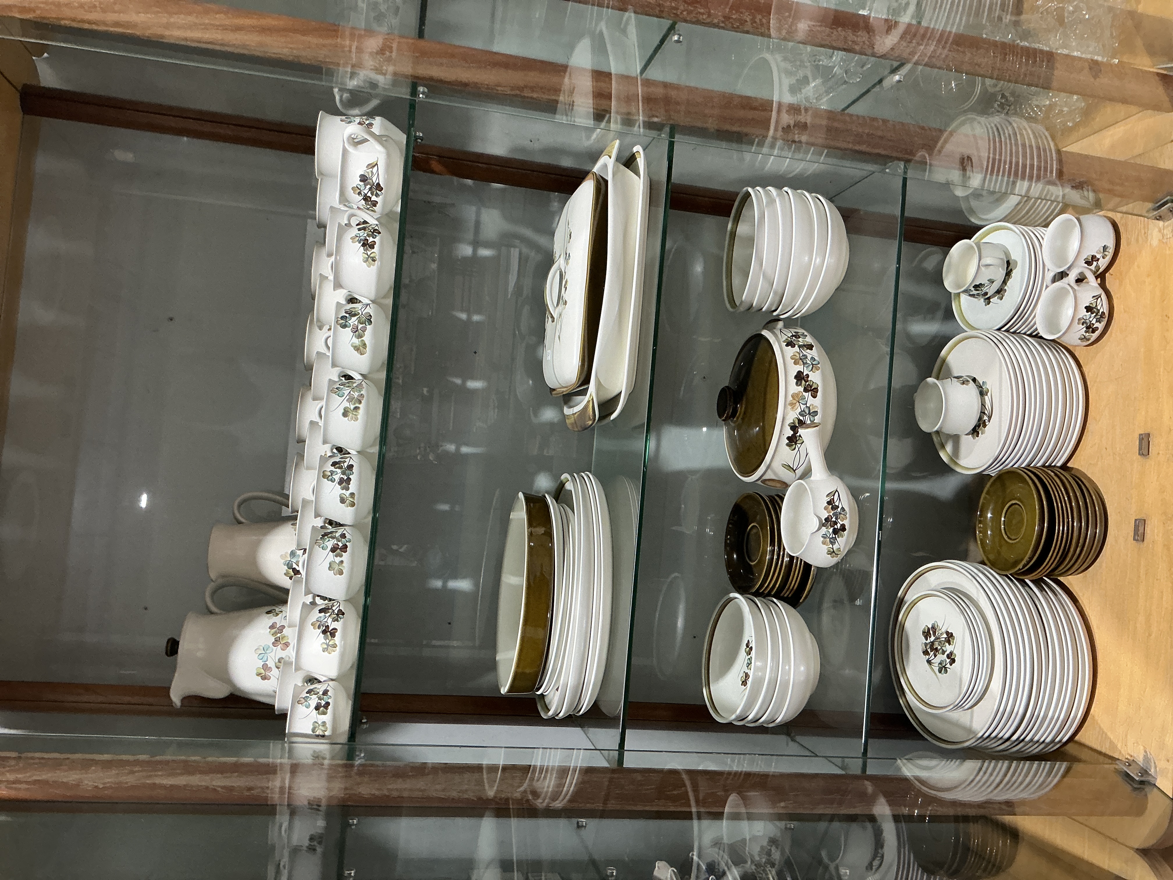 This extensive 104-piece dinner and tea service is crafted from glazed earthenware, featuring a design characteristic of mid-20th-century British pottery. The decoration consists of a transfer-printed stylized floral pattern with blossoms in muted shades of brown, blue, and green set against a cream-coloured ground. Several components, including the lids, bowl exteriors, and saucers, are finished in a contrasting solid chocolate-brown glaze. The collection comprises a large rectangular lidded tureen, a circular lidded tureen, two jugs (one with a lid), teacups, stacks of dinner plates, side plates, and saucers, various soup and dessert bowls, egg cups, and a sauce boat. No maker’s marks are visible on the pieces shown.