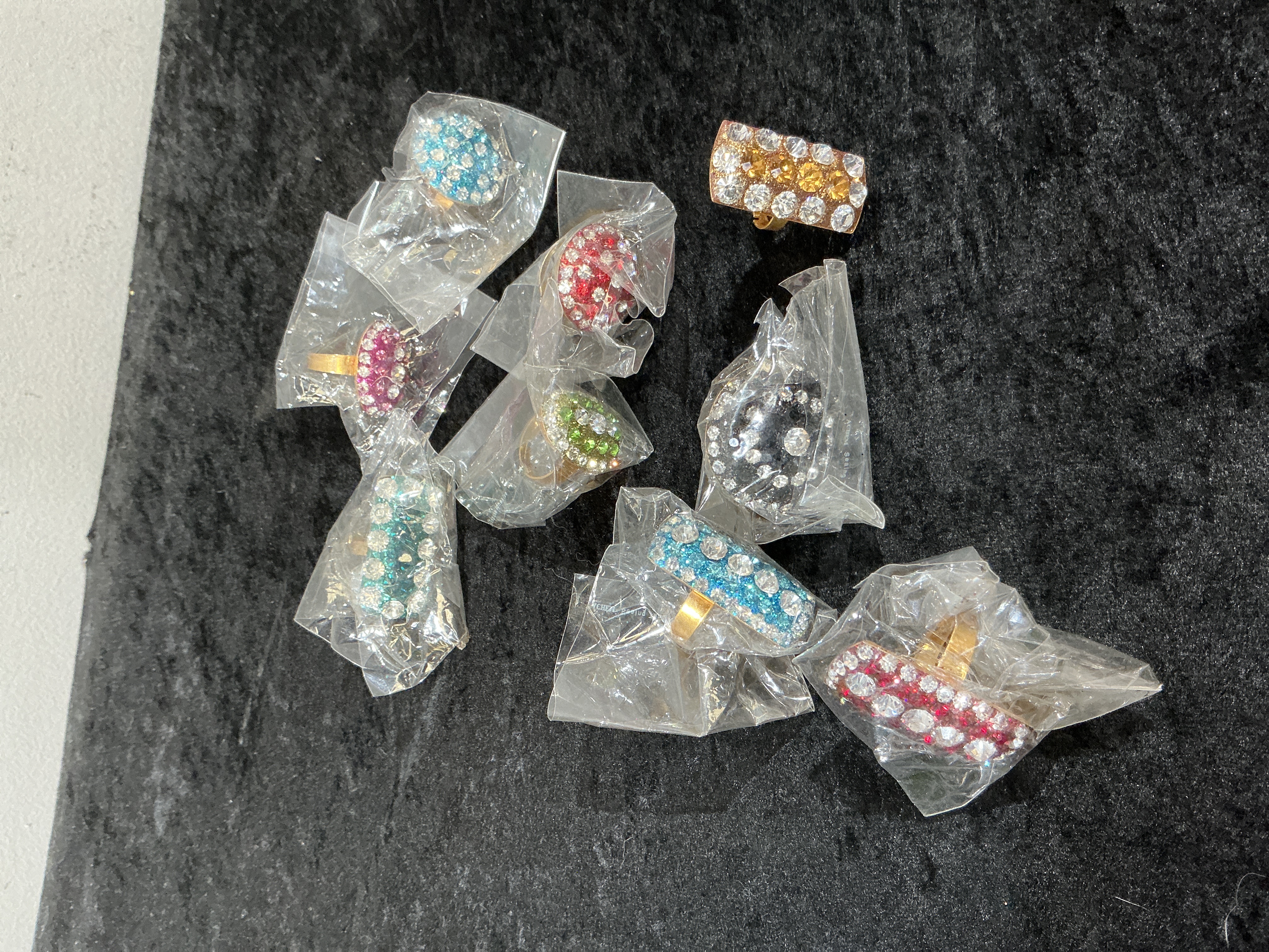 A Collection of 100 Yellow-Gold Tone Costume Cocktail Rings Set with Multi-Coloured Rhinestones
