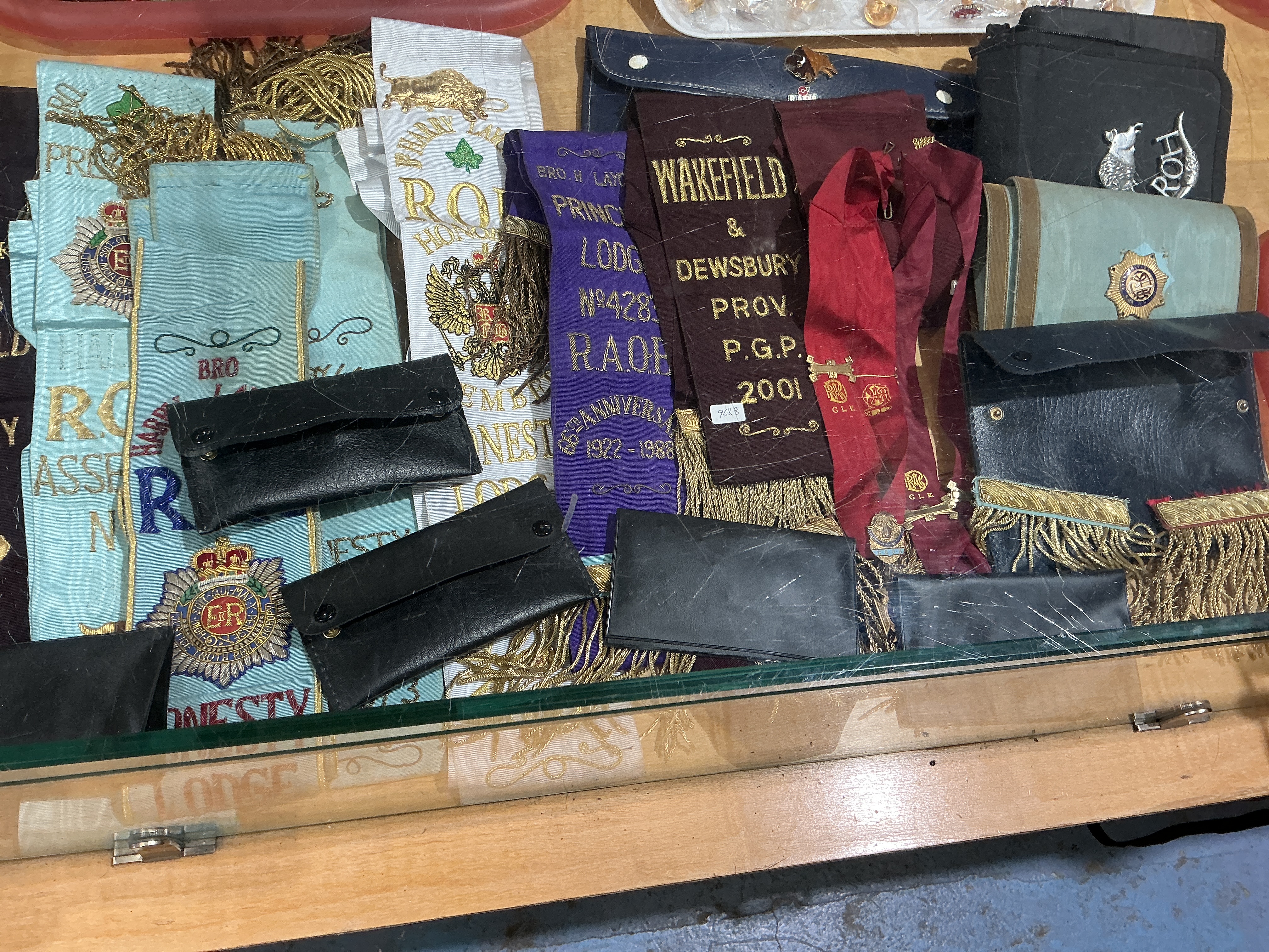 This collection comprises an assortment of fraternal regalia and accessories belonging to the Royal Antediluvian Order of Buffaloes (RAOB), dating from the mid-20th century to the early 21st century. The items are primarily associated with the West Yorkshire region, specifically the Wakefield and Dewsbury Province. The regalia is constructed from silk and synthetic ribbons with gold-tone bullion wire fringe and multi-coloured embroidery.