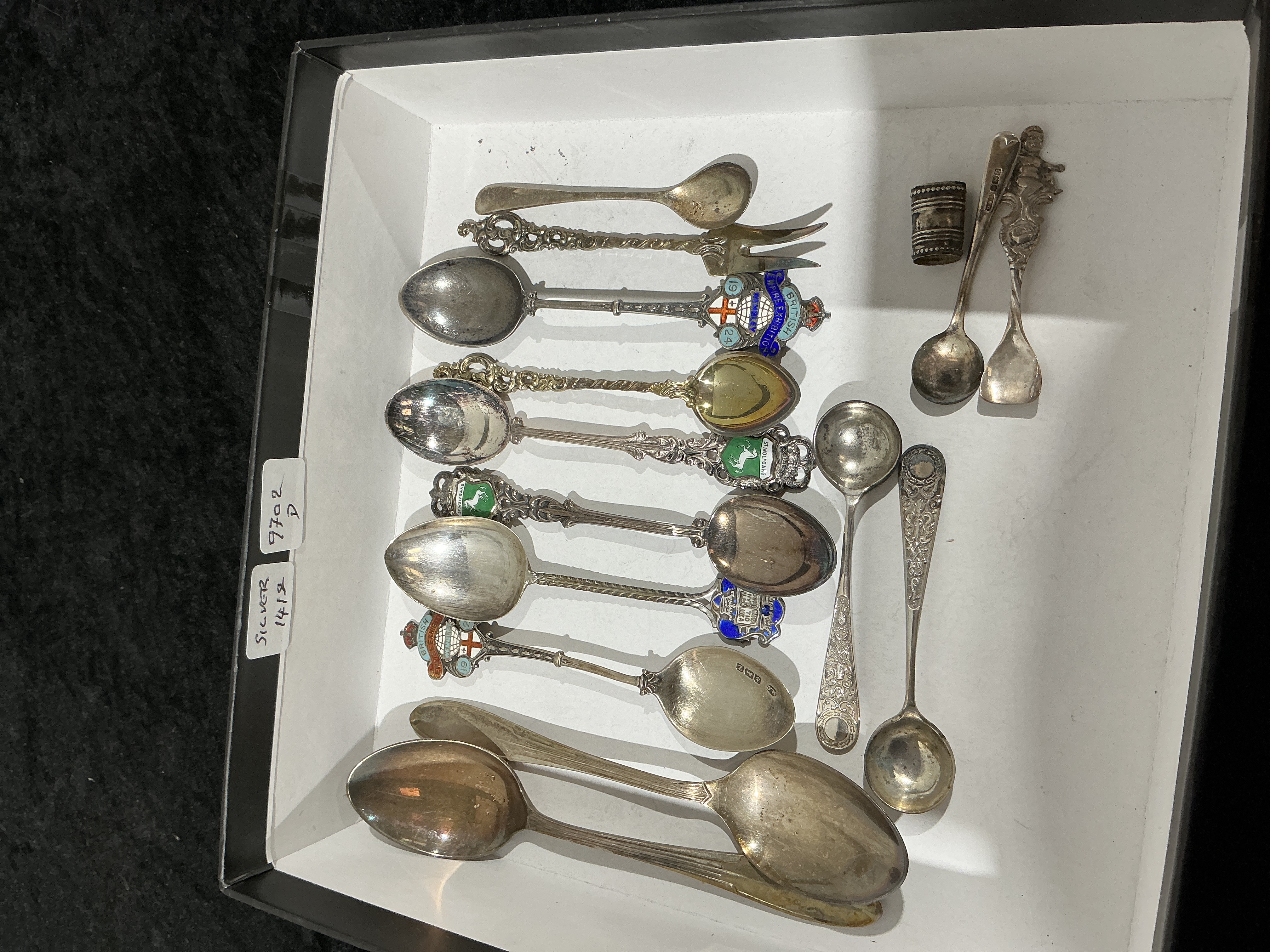A collection of silver and silver-plated items comprising various souvenir spoons, decorative flatware, and a napkin ring. The group includes two commemorative spoons for the 1924 British Empire Exhibition featuring enamel finials with the exhibition crest and date. Continental souvenir spoons are present, including an example with a green enamel shield for St. Wolfgang and another with blue enamel decoration. The collection also features a spoon with a cast figural finial in the apostle style, several spoons with twisted stems and scrolling finials, a small fork with a twisted handle, and a chased napkin ring with scrolled decoration. One large spoon is struck with the lion passant for sterling silver, the anchor for the Birmingham Assay Office, and a gothic lowercase date letter b, corresponding to 1926. Other pieces bear various marks on the reverse of the stems, including enamel inscriptions and maker’s marks.